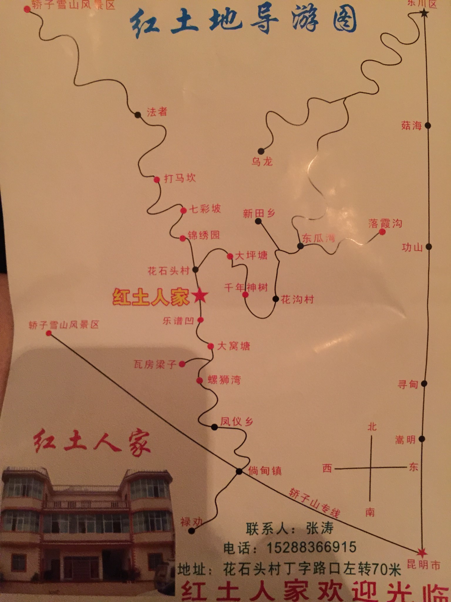 店家在我们入住后给了一张游览图,红土地区域的浏览主要是三条线,很清晰,以花石头村为中心(大多数住宿客栈都在这),往北一直到打马坎,打马坎是早起看日出的地方,往南一直到螺狮湾,拍夕阳就往南走,还有一条奔东去往千年神树的。图上写了这么多景点,其实只有偶尔2-3个会在路边写上标识,基本是看到景好的地方就停车了。
