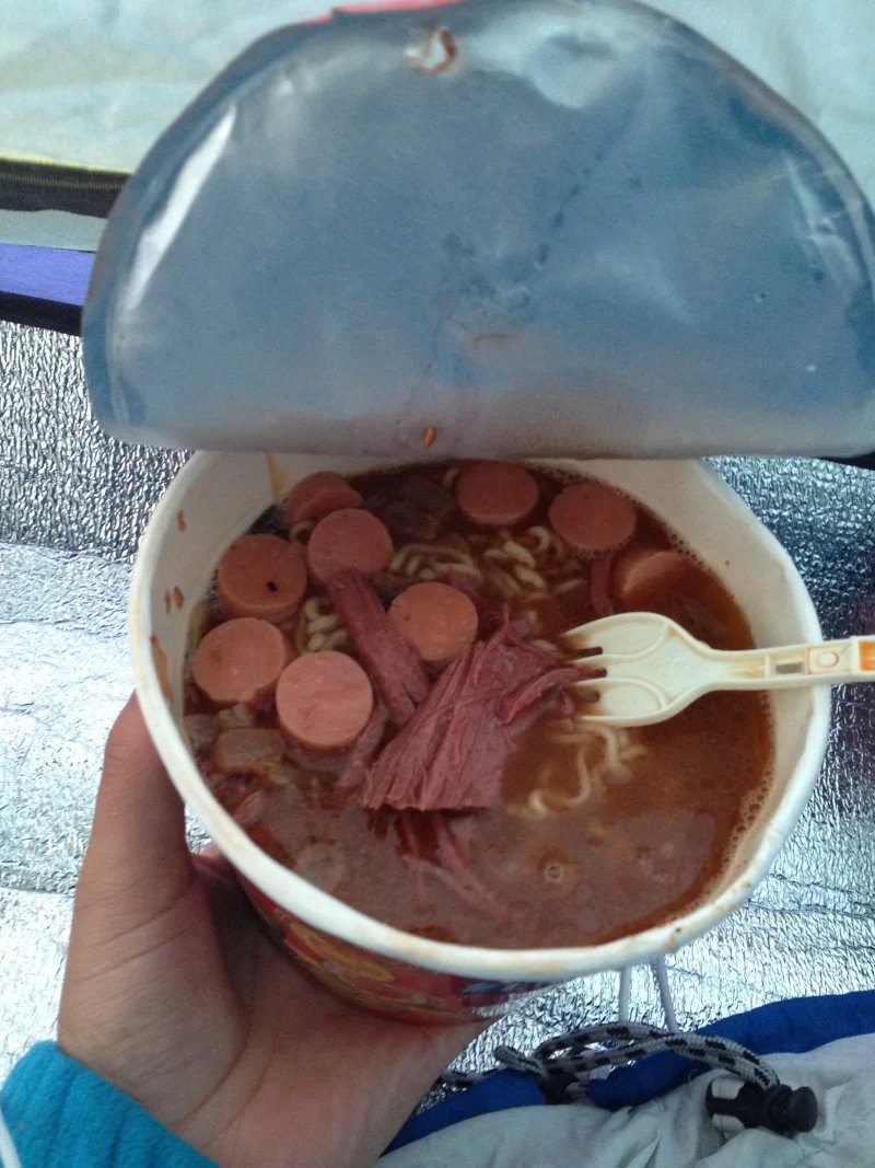 天色暗下来真山上真的的好冷啊,冻得打哆嗦啊,赶紧回帐篷啊。山上能吃到煮方便面,啊~美食啊!