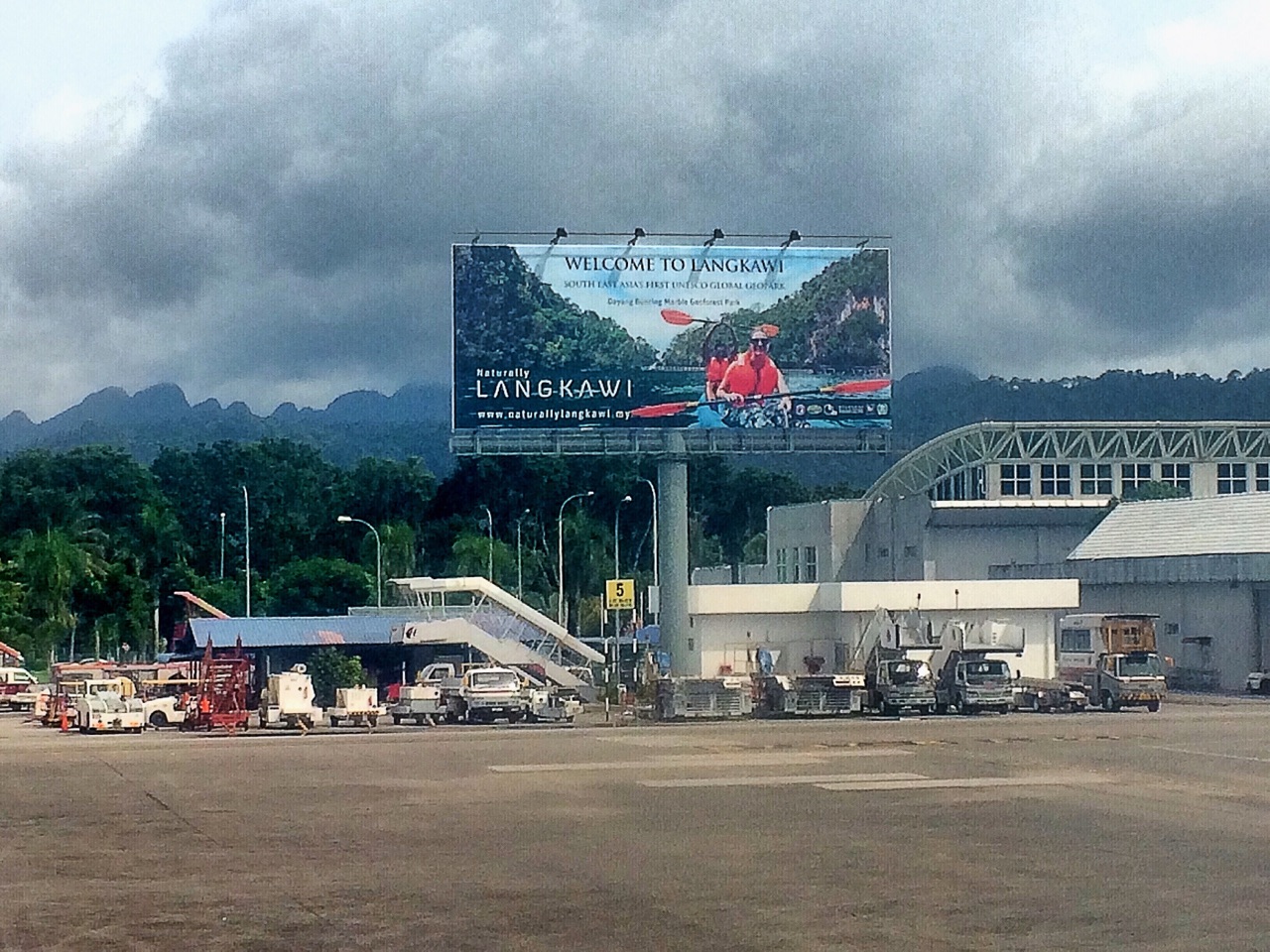 兰卡威机场位于岛部西南面靠海的一块平地上。机场较小,没有廊桥,也没有摆渡车,下机后步行到航站楼。步行没有几步就到行李提取大厅。大厅周围一圈都是租车公司,建议在里面洽谈完成。出了大厅在想进来就不行了,而且外面租车的小黑也是找里面的老板出来谈的。