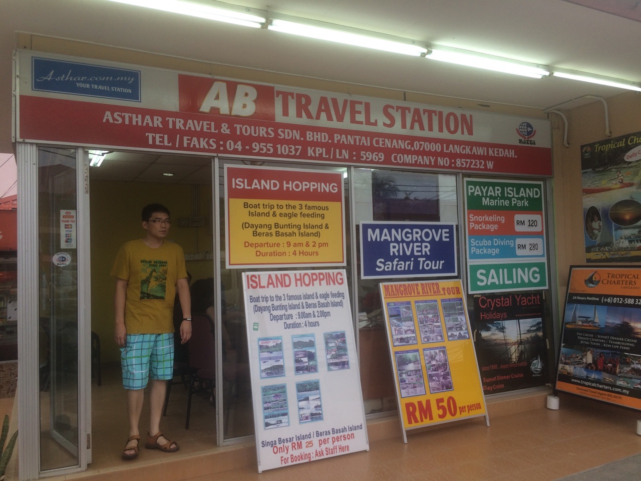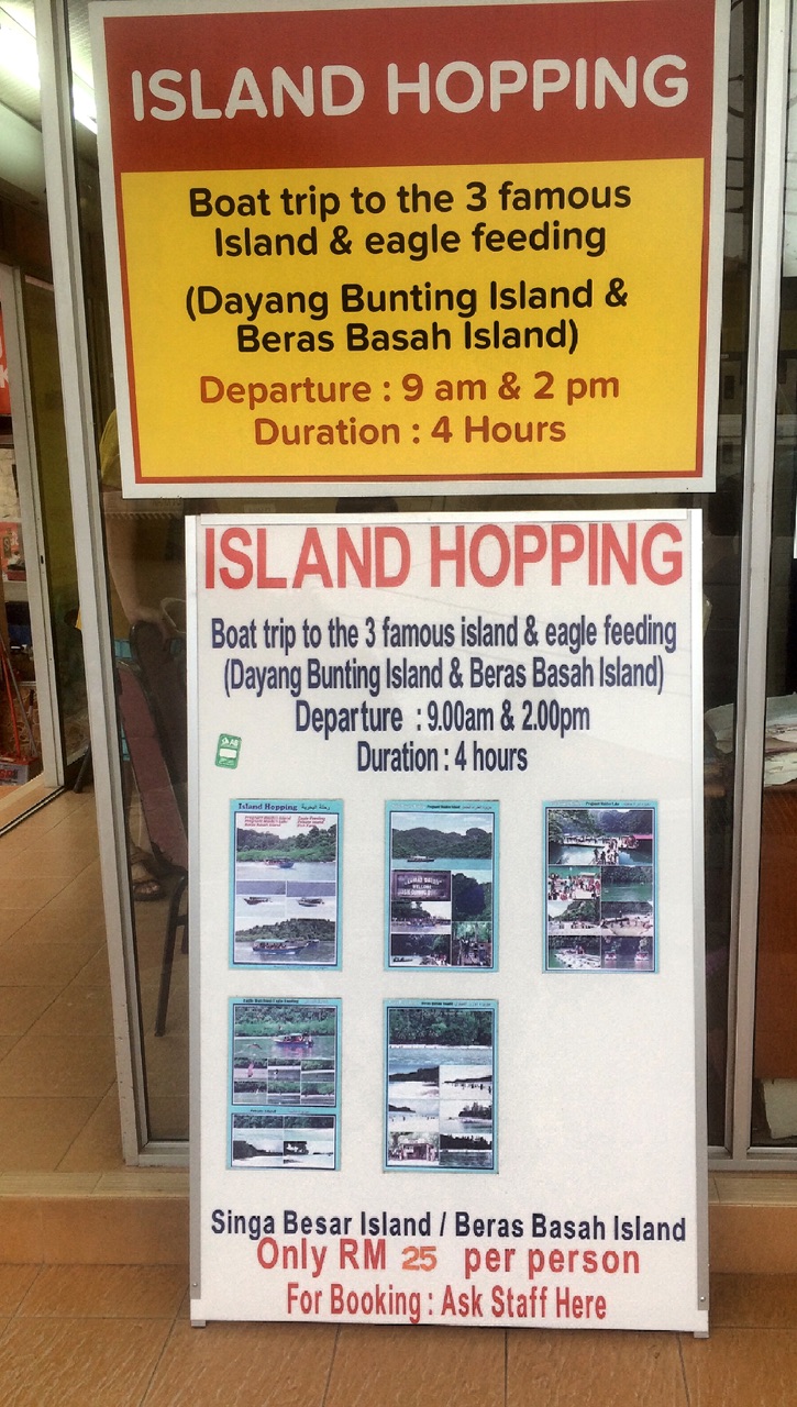 由于连续飞行大家比较累,到了酒店就安排睡觉了。睡醒第一件事就是去珍南海滩的AB HOTEL预定跳岛游。AB酒店很好找,在珍南海滩道路的中部。普通跳岛游会去三个岛,上岛两个,看一个老鹰喂食。全程四个小时,包含接送酒店的时间,所以正真出海只有3小时。上岛事件基本控制在一个小时。去孕妇岛上的门票不包含在里面。全程25RM,也就是船票费。全船15人左右,也可以包船,大概300RM左右。