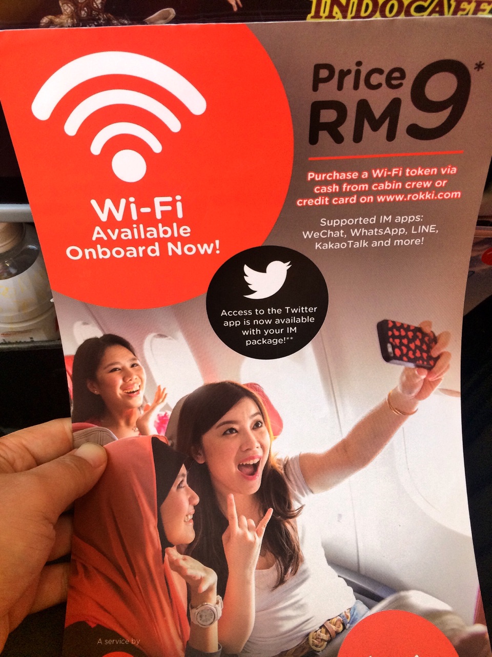 现在亚航在国内段可以飞机上网了,9RM有5M流量,给你上网聊天没有问题
