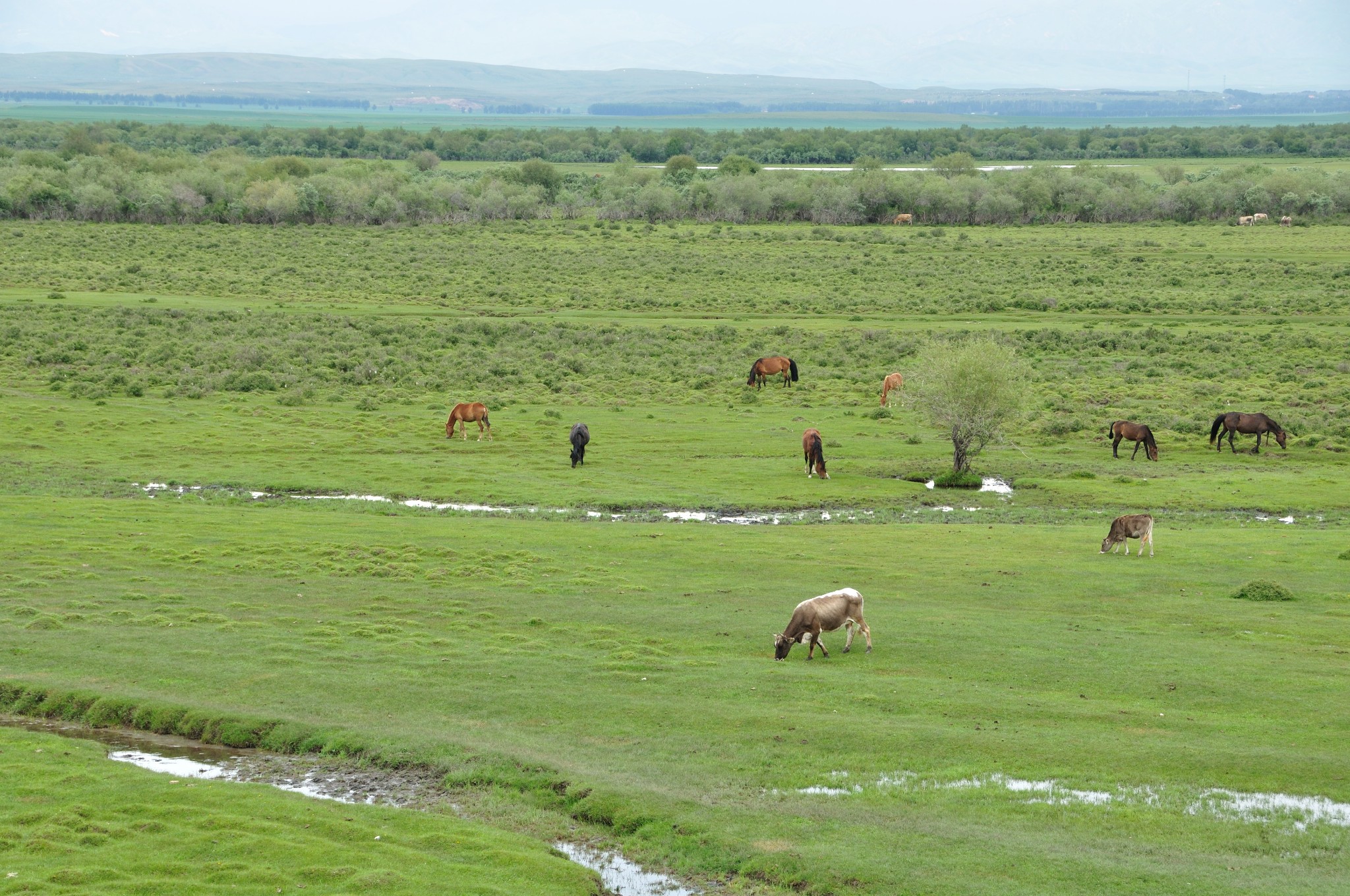特克斯—昭苏近70公里,柏油路、路况好。我们再次经过八卦公园景区,进入S220,沿途有一开粉红色花的河滩,拍照不错,中间经过一边防检查站,需登记车牌、出示身份证,好快到达昭苏县城。时间还早,继续赶路。昭苏—夏塔景区门口近80公里,柏油路、路况好。入、出昭苏县城路两边种植了大片大片的油菜,有些早种的已开出朵朵小花,看油菜花最好季节是七月。途径昭苏军马场,以为可以看看军马,开车过去原来是一地方名而已。过了军马场,经过特克斯河谷,好多马啊!而且是好漂亮的马。玩玩、拍拍,吃午饭时间到了,沿途一直没有看到好吃住地方。经过75团有一农家乐,找找就开进去了,像是东北人2、3代开的,有鸵鸟、走地鸡(现宰、炖等了好久),还有疙瘩汤(第一次吃),味道不错。我们也顺便在蒙古包里休息、拍照。