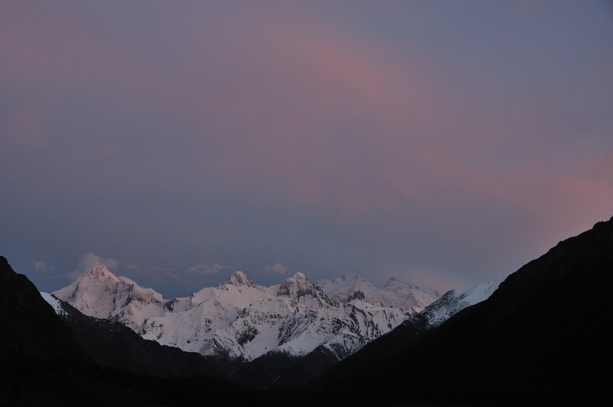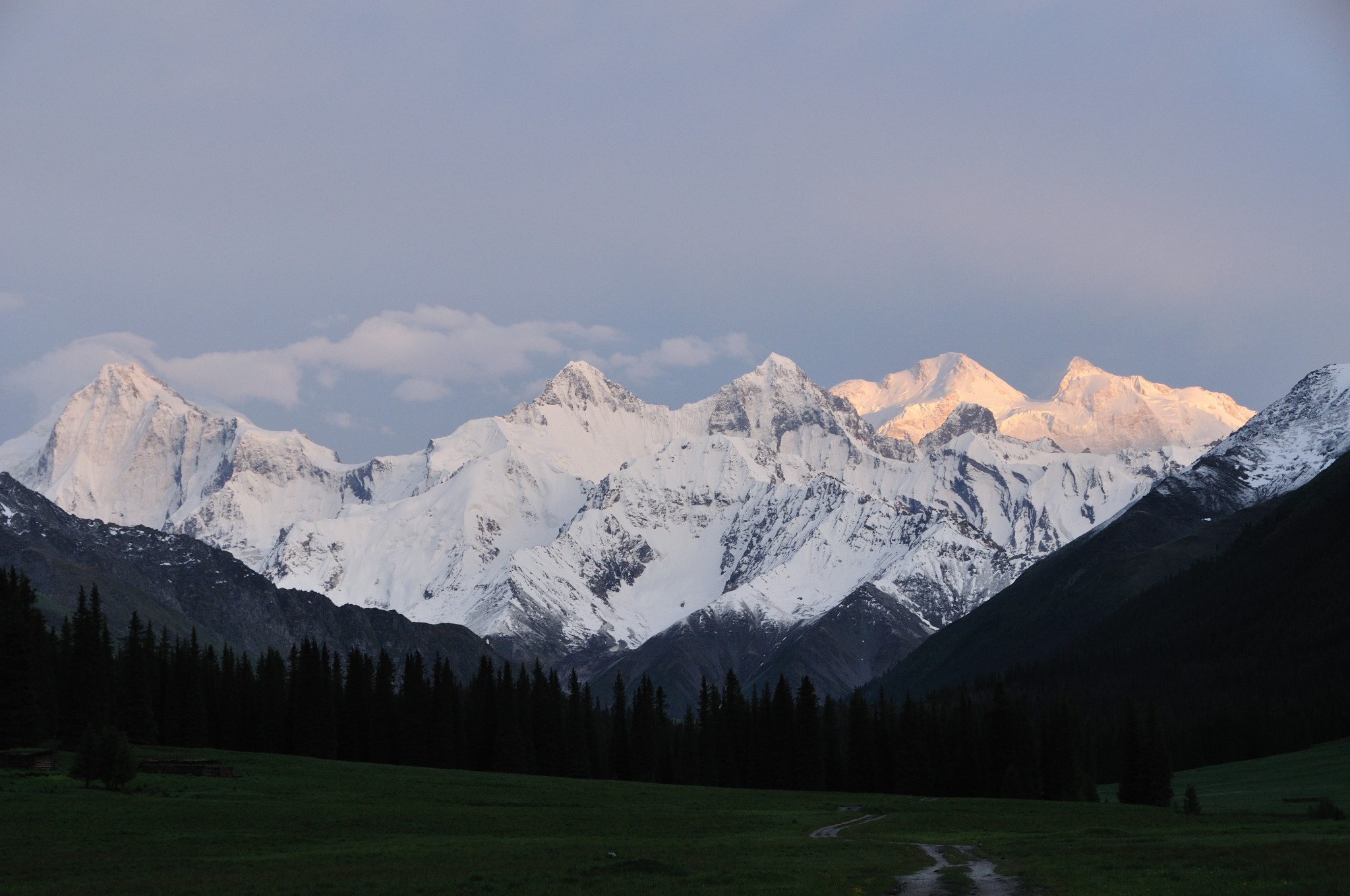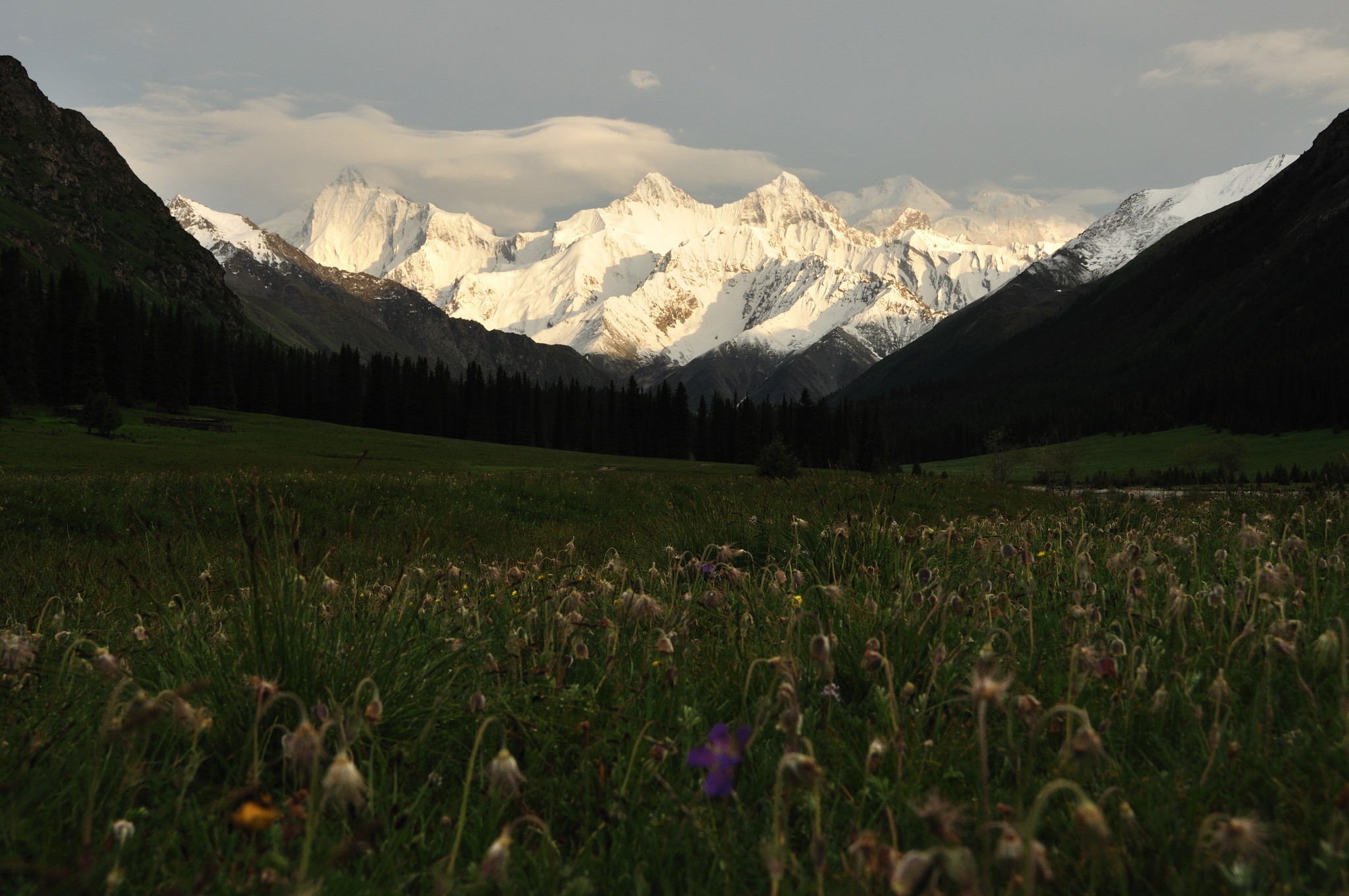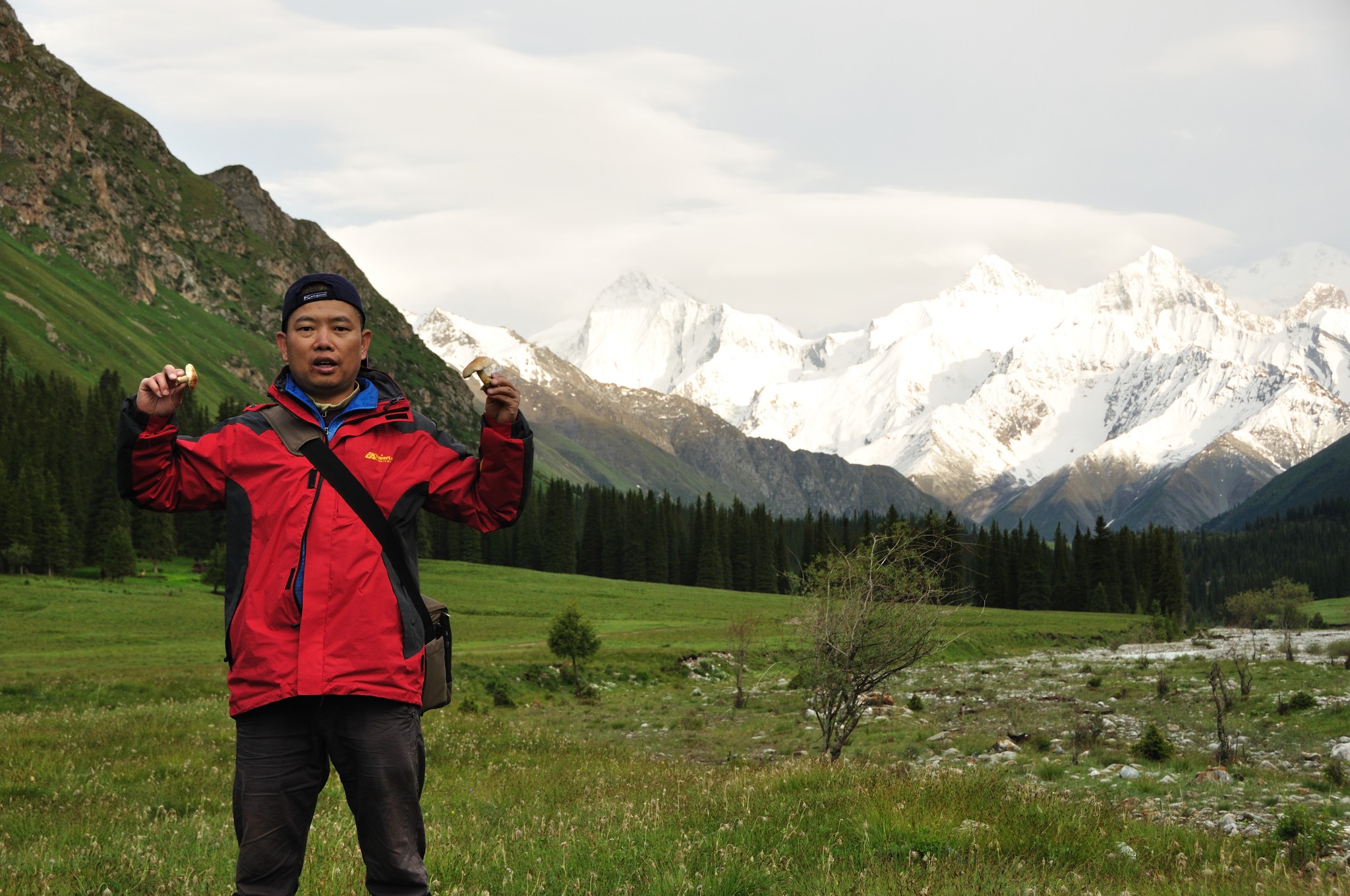 雨后新修的路电瓶车不能走,只能在丛林间穿行啦,到达车不能再前行的地方,约好师傅来接的时间,我们继续徒步前行。雨后的草地很湿,我们的鞋都湿透啦,只有靓女翁带了雨鞋套幸免。雨停,天也越来越亮,我们也走了一段路,考虑到人少、回程天会黑就没有继续走到当地牧民顶上长草木头房子处,就在在山谷、河边、草地上慢慢拍照慢慢等日照金山,摘到两大蘑菇,拍完照忘带回了,可惜!拍到两只小小鸟,兴奋!慢慢的木札尔特冰川上的云雾上升变成旗云,金色的阳光洒在冰川上,失望、下雨、鞋湿、等待,所有的所有都是值得的。依依不舍一步一回头遥望着冰川回到坐车处,小伙子一早已等着我们啦,再赞一个!