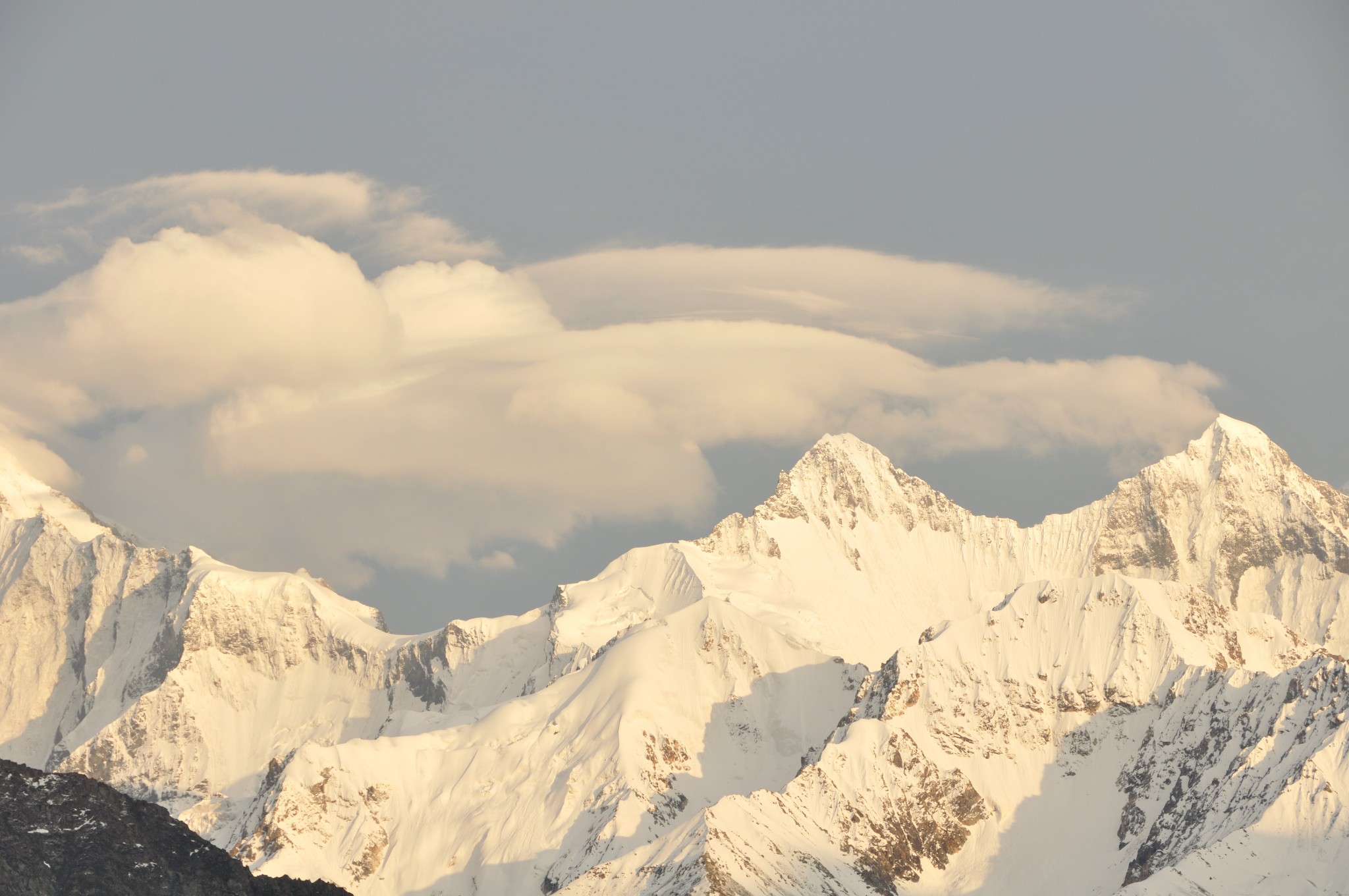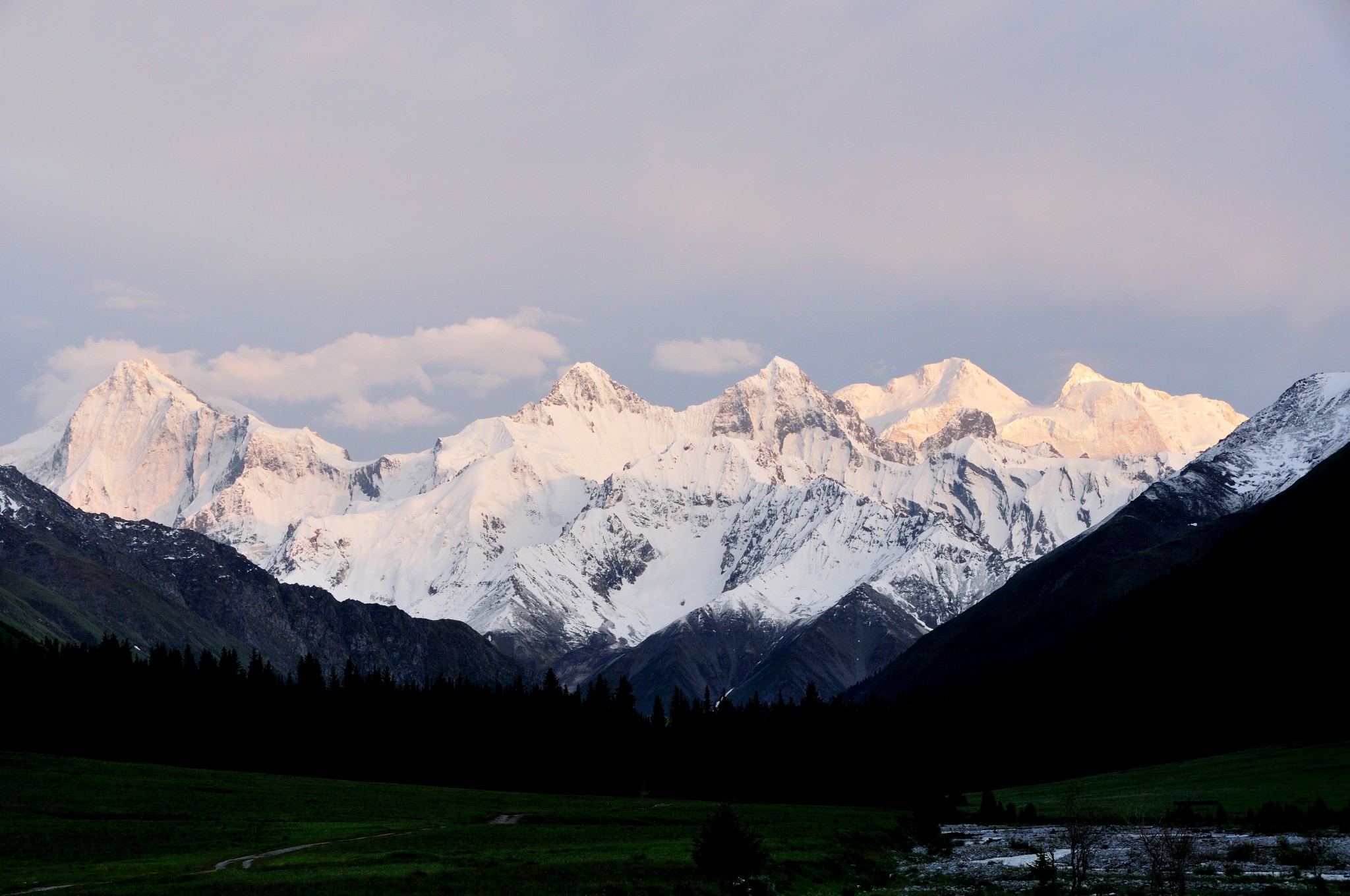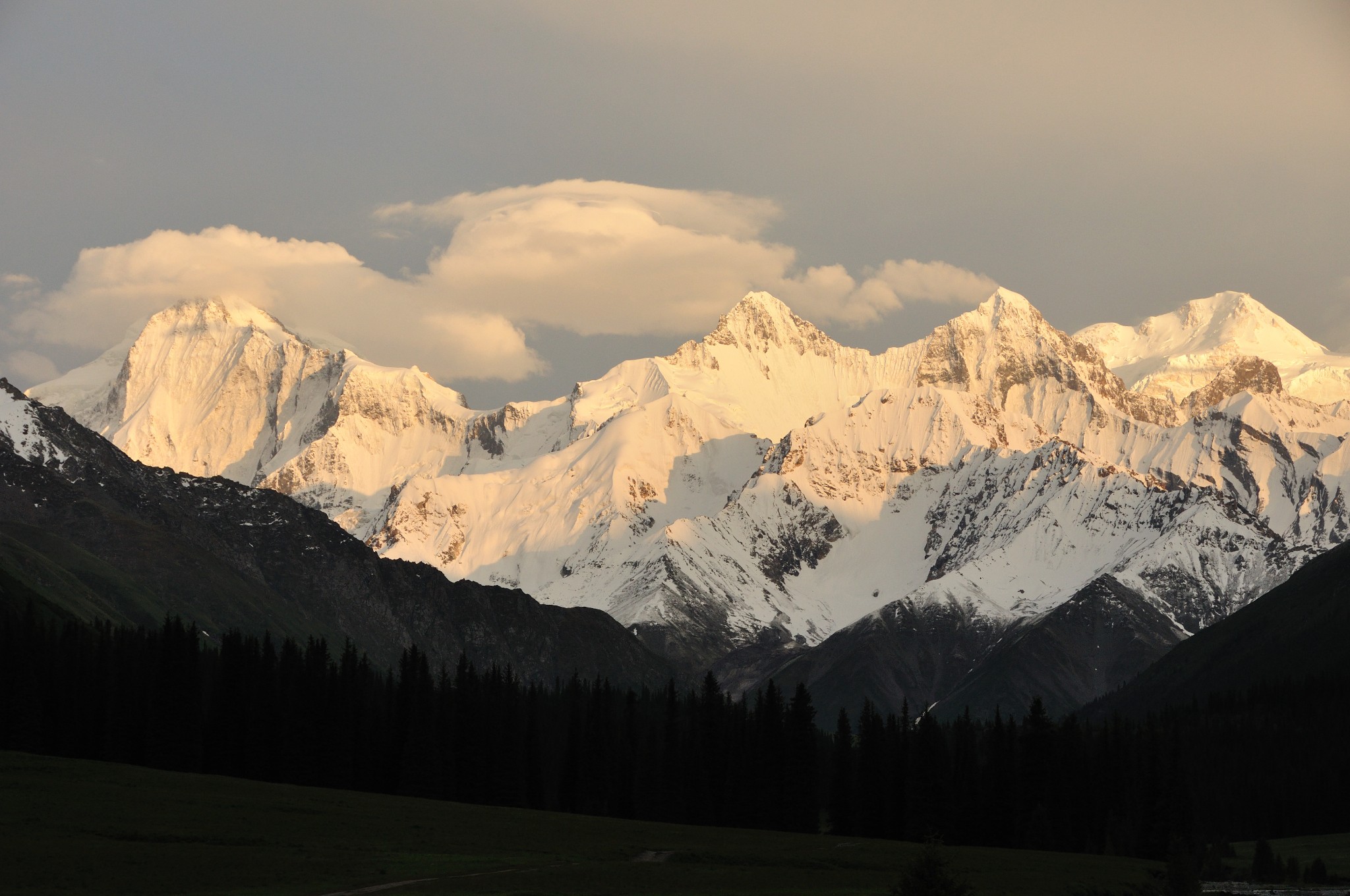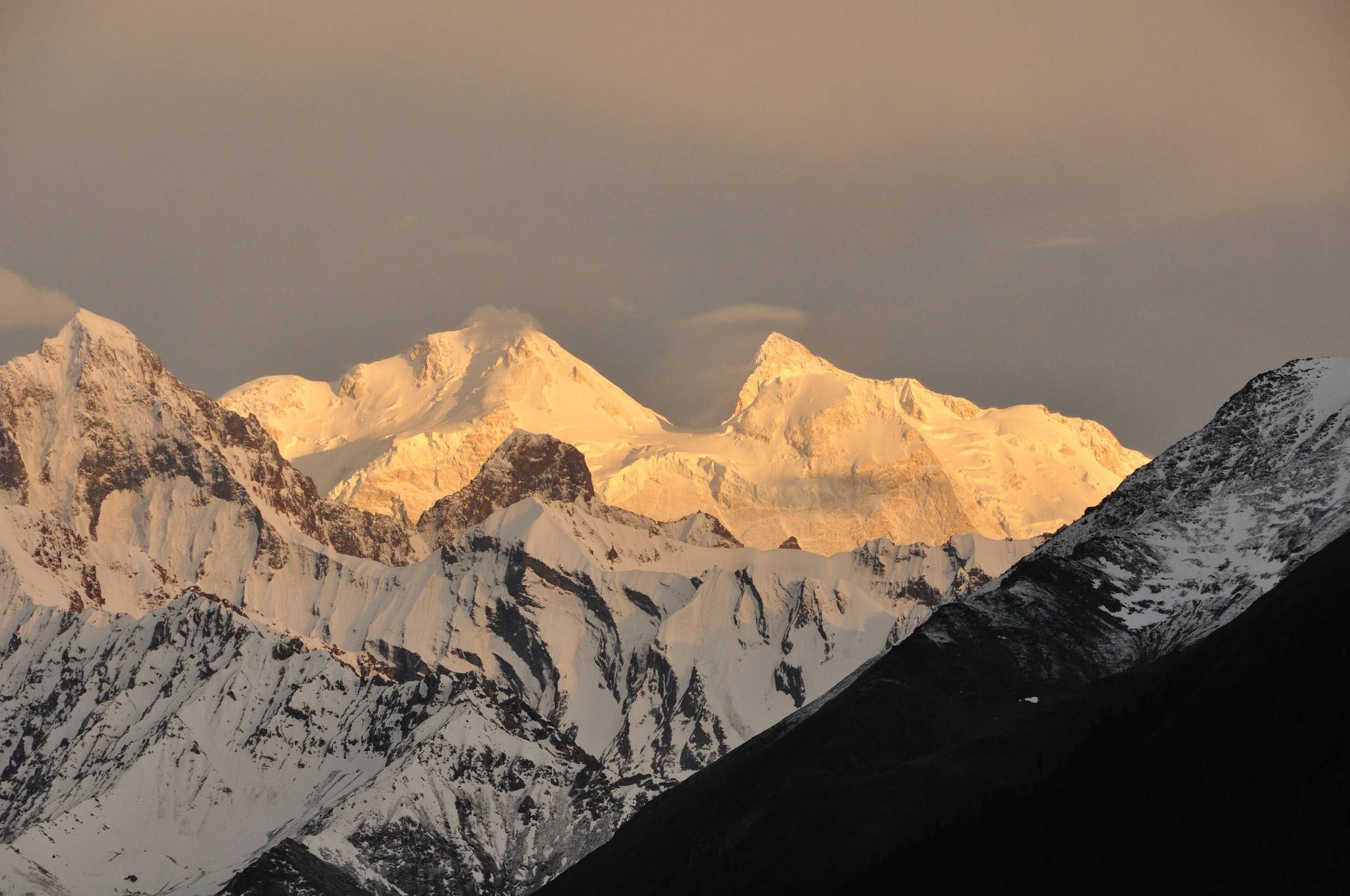 雨后新修的路电瓶车不能走,只能在丛林间穿行啦,到达车不能再前行的地方,约好师傅来接的时间,我们继续徒步前行。雨后的草地很湿,我们的鞋都湿透啦,只有靓女翁带了雨鞋套幸免。雨停,天也越来越亮,我们也走了一段路,考虑到人少、回程天会黑就没有继续走到当地牧民顶上长草木头房子处,就在在山谷、河边、草地上慢慢拍照慢慢等日照金山,摘到两大蘑菇,拍完照忘带回了,可惜!拍到两只小小鸟,兴奋!慢慢的木札尔特冰川上的云雾上升变成旗云,金色的阳光洒在冰川上,失望、下雨、鞋湿、等待,所有的所有都是值得的。依依不舍一步一回头遥望着冰川回到坐车处,小伙子一早已等着我们啦,再赞一个!
