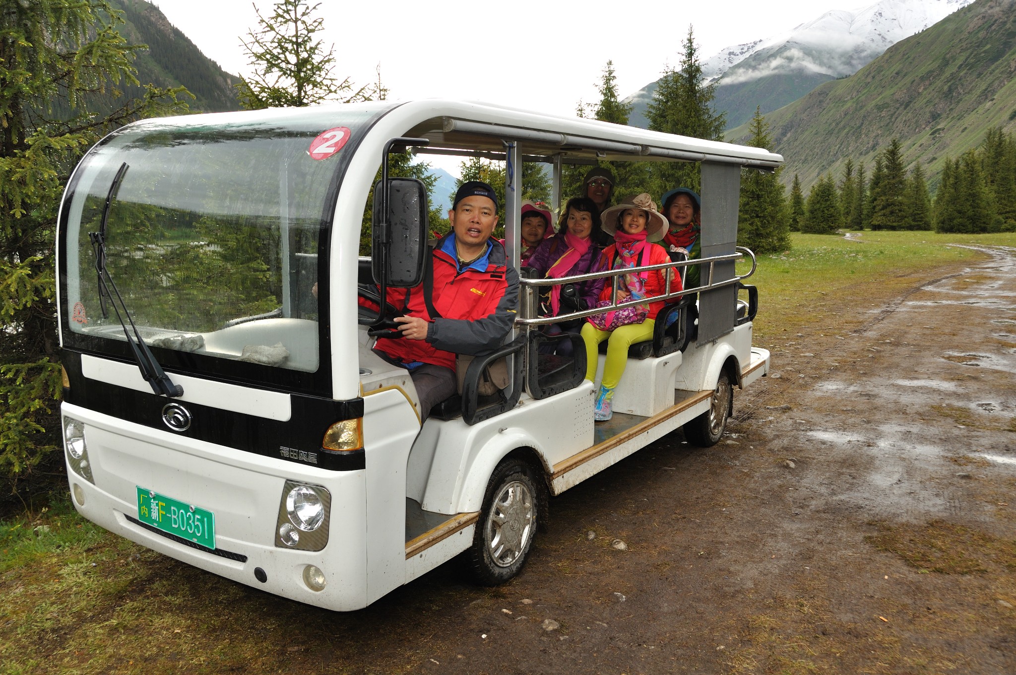 出酒店顺着木栈道往里走走,好快就到木头房子及毡房,碰到电瓶车师傅,聊住宿(怀疑我们住酒店)、天气、雪山、日照金山等,说太阳出来机会不大,但我看天越来越亮,雾散开更快啦。咨询到电瓶车到“最佳观景点”约3-4公里沙土路30/人,早上看日出需预约再加加班费。想到天气可能马上转好,而且明天天气也不能保证,决定加20总200/6人马上出发进入“最佳观景点”,回过头想想这个决策是非常非常的英明。