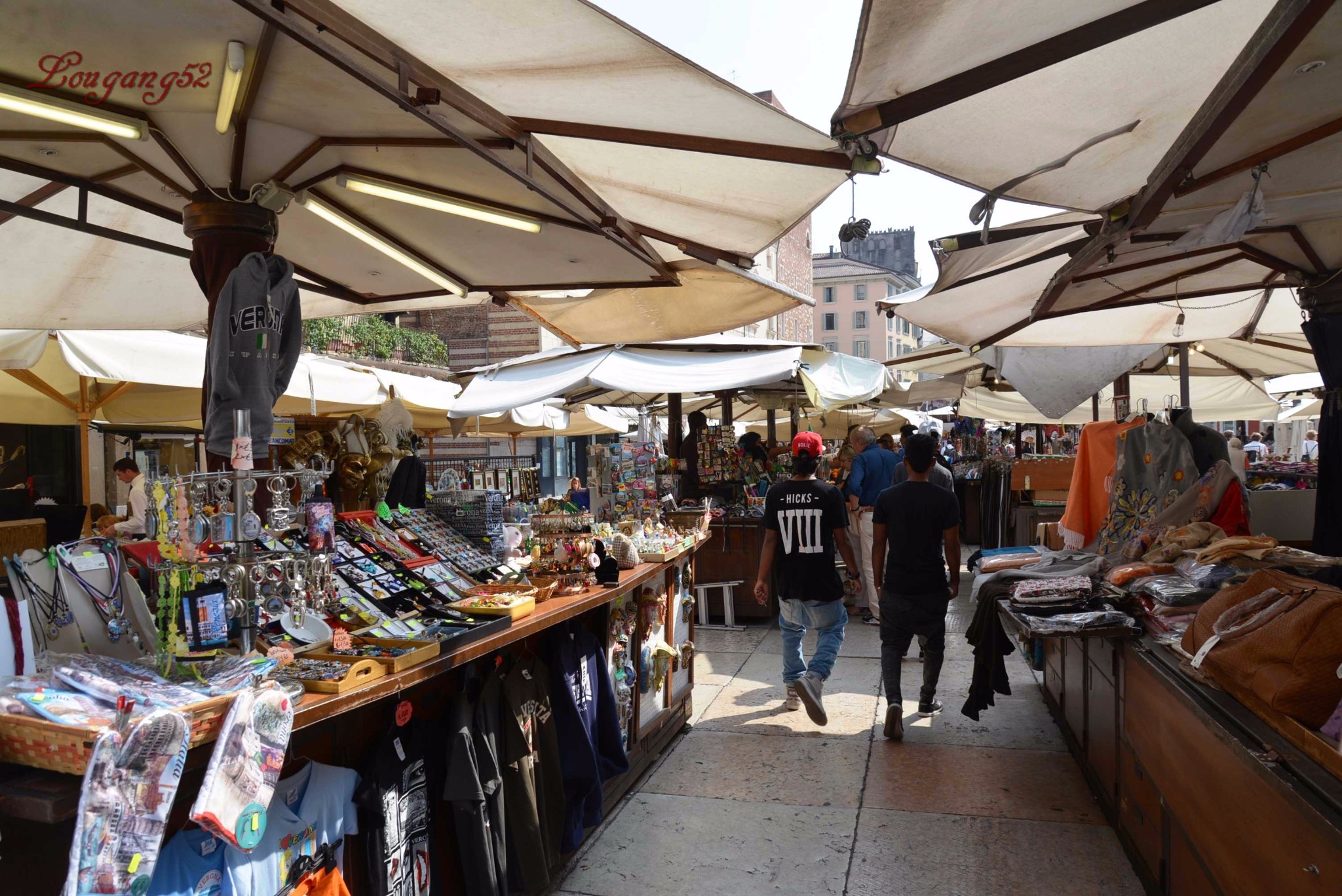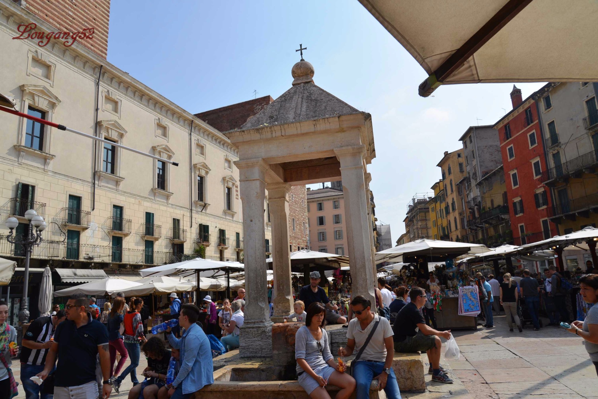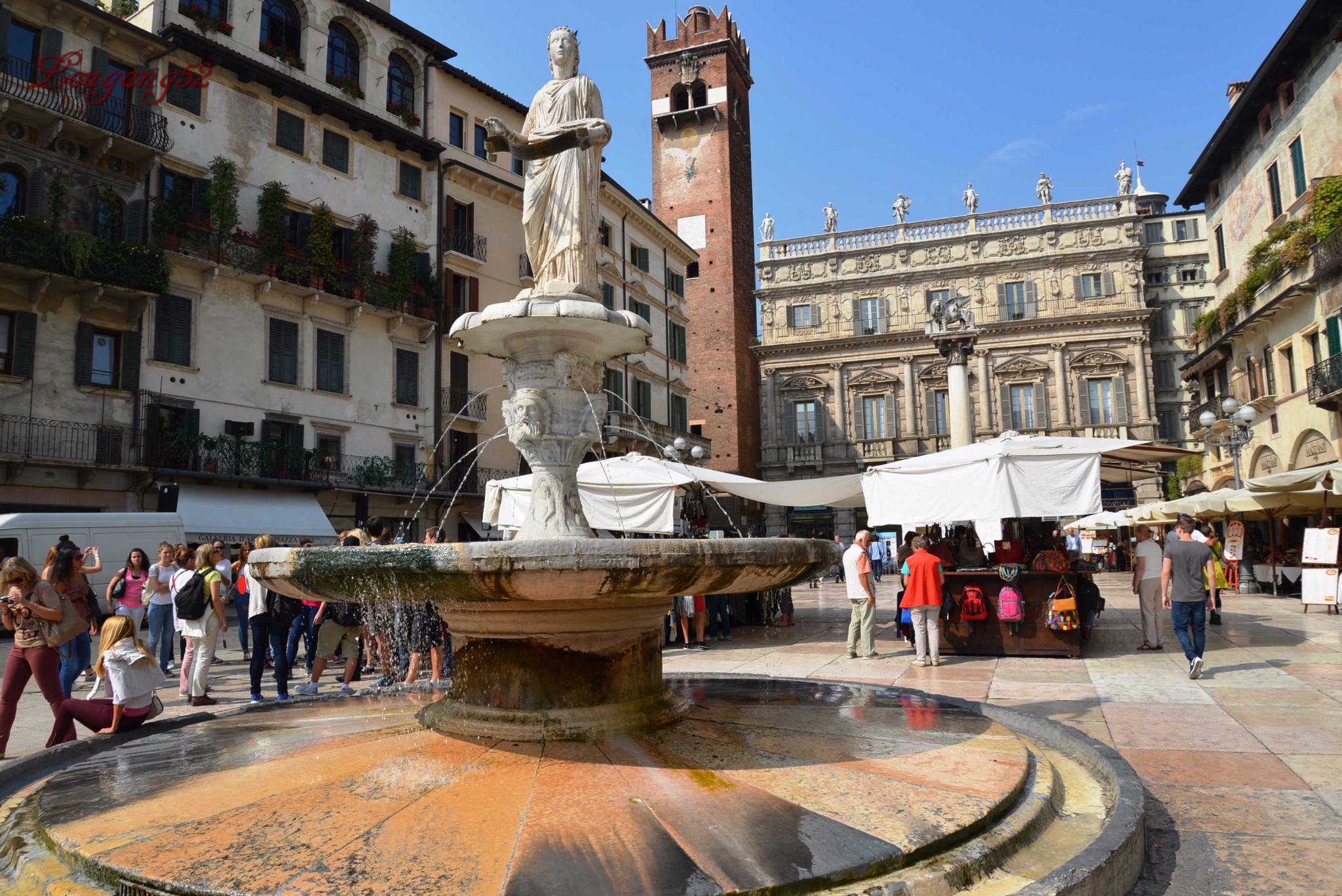现在,各式各样的水果、蔬菜、花卉商铺覆盖了整个广场,看上去更像是一个大集市,广场中央有建于14世纪、名为“维罗纳的爱人”的喷泉,广场周围的建筑物都是从中世纪到文艺复兴时期的豪华别致的楼堂馆所。
