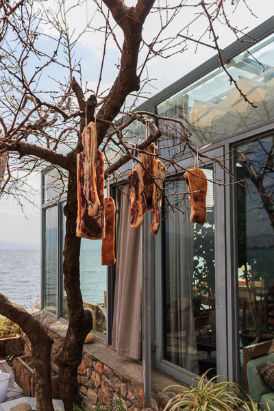 院内树上挂着腊肉,旁边就是餐厅。