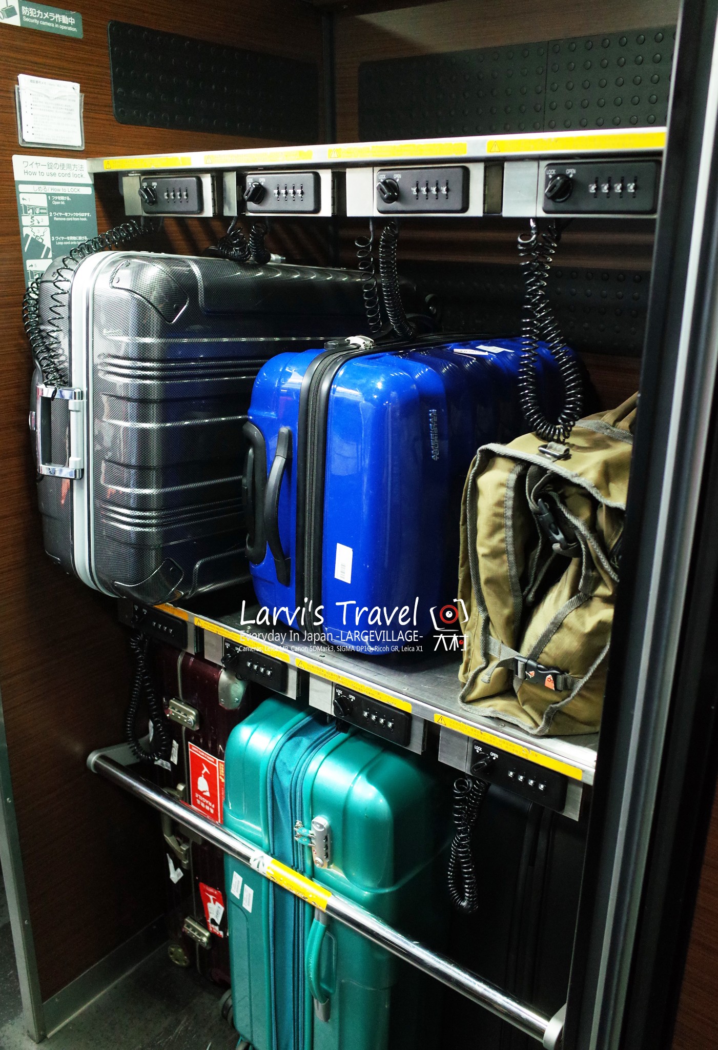 通常我们坐火车之类的会担心行李箱放在后头,会不会丢失。虽然在日本,治安很不错,但大部分人往返机场时行李箱里都会带着贵重物品,万一被拖走行李,可就坑爹了。所以NEX上有锁住行李的密码锁,非常方便,使用方法也非常简单,如图所示,把箱子串入锁扣,就OK了