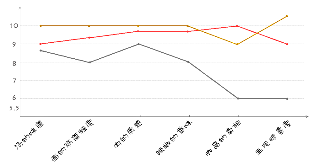分别从汤的味道、面的筋道程度、肉的质感、辣椒的香味、成品的卖相和主观惊喜度这六个方面进行了对比 ↓