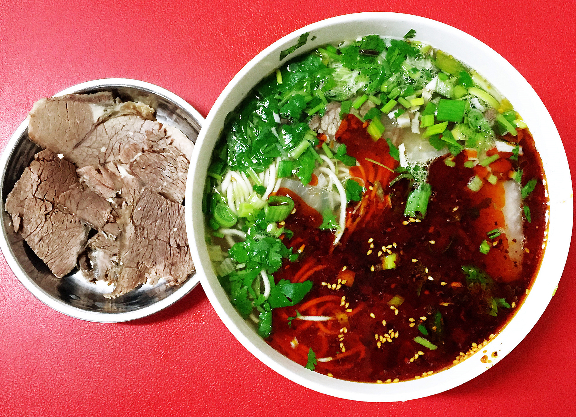 跟着曾经在兰州工作过的朋友,来到她经常去的一家位于居民区的面馆,这肉香汤浓、青红皂白的第一碗牛肉面,在这个本该没那么横的早餐时段,让我心里好满。