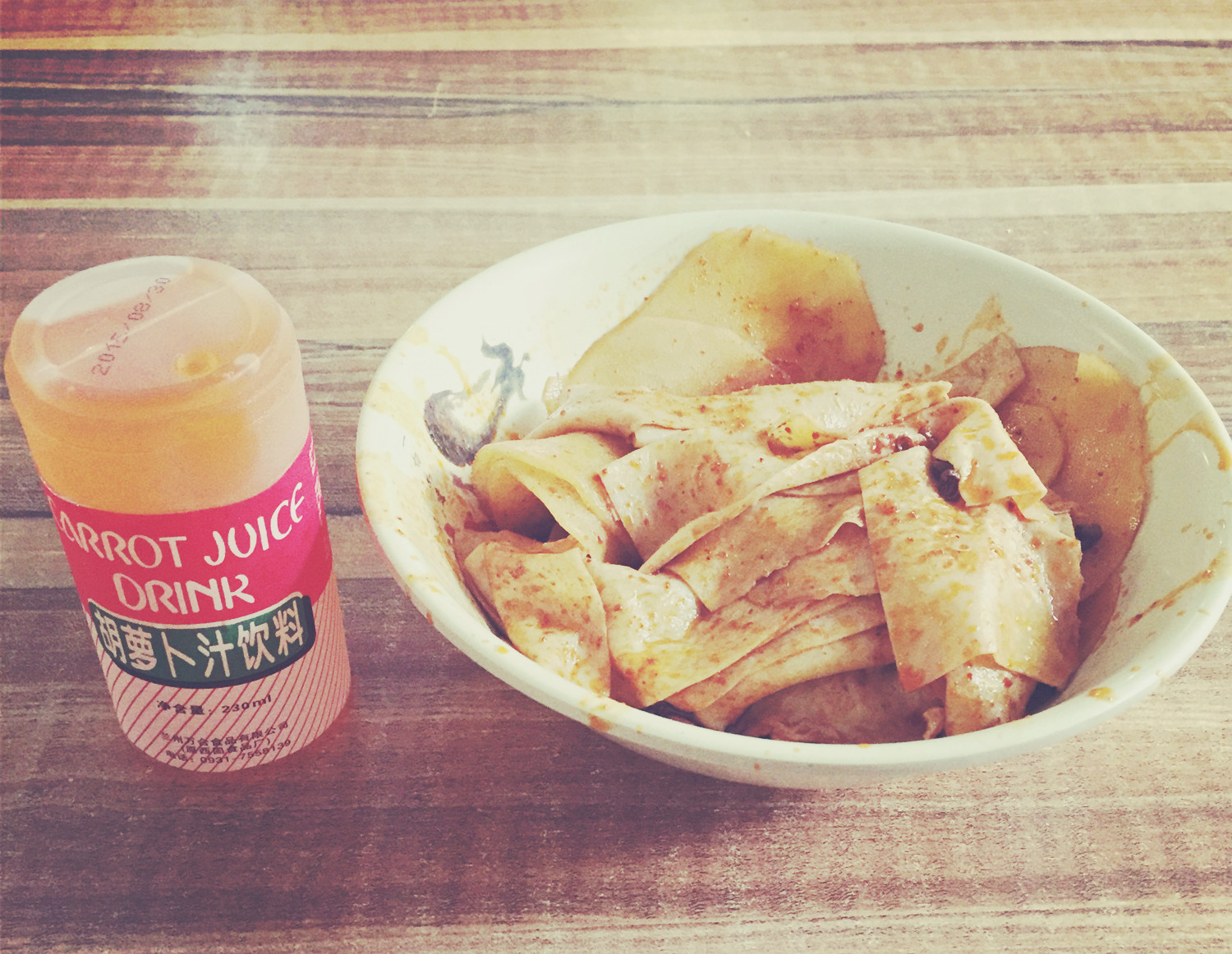 胡萝卜汁的味道很像是小时候喝的摩奇软包装,总之很怀念;辣椒的味道好香!就是太油了,但总归是好评!