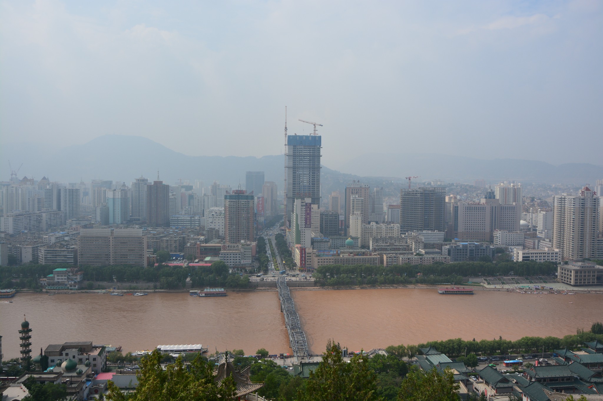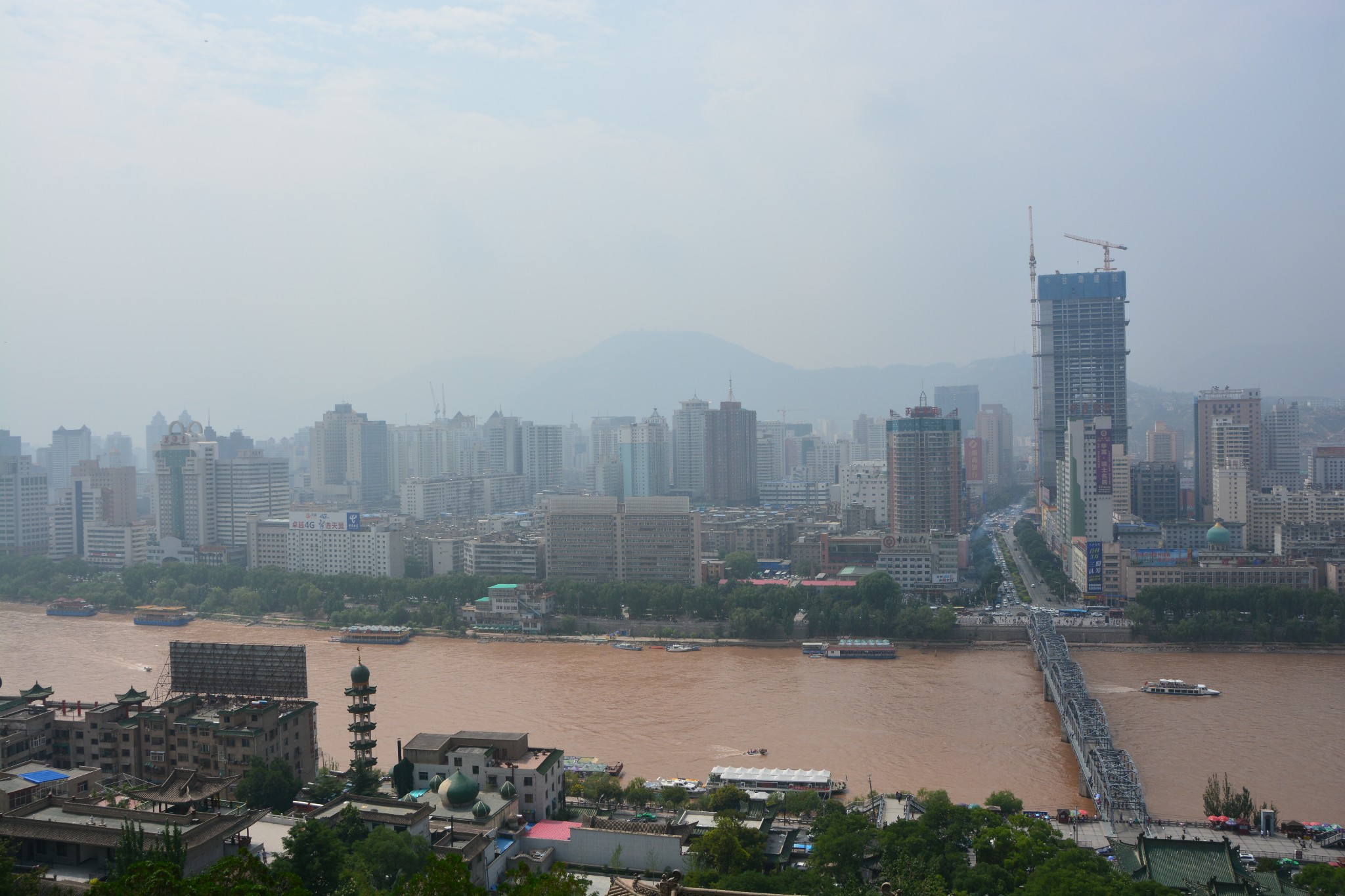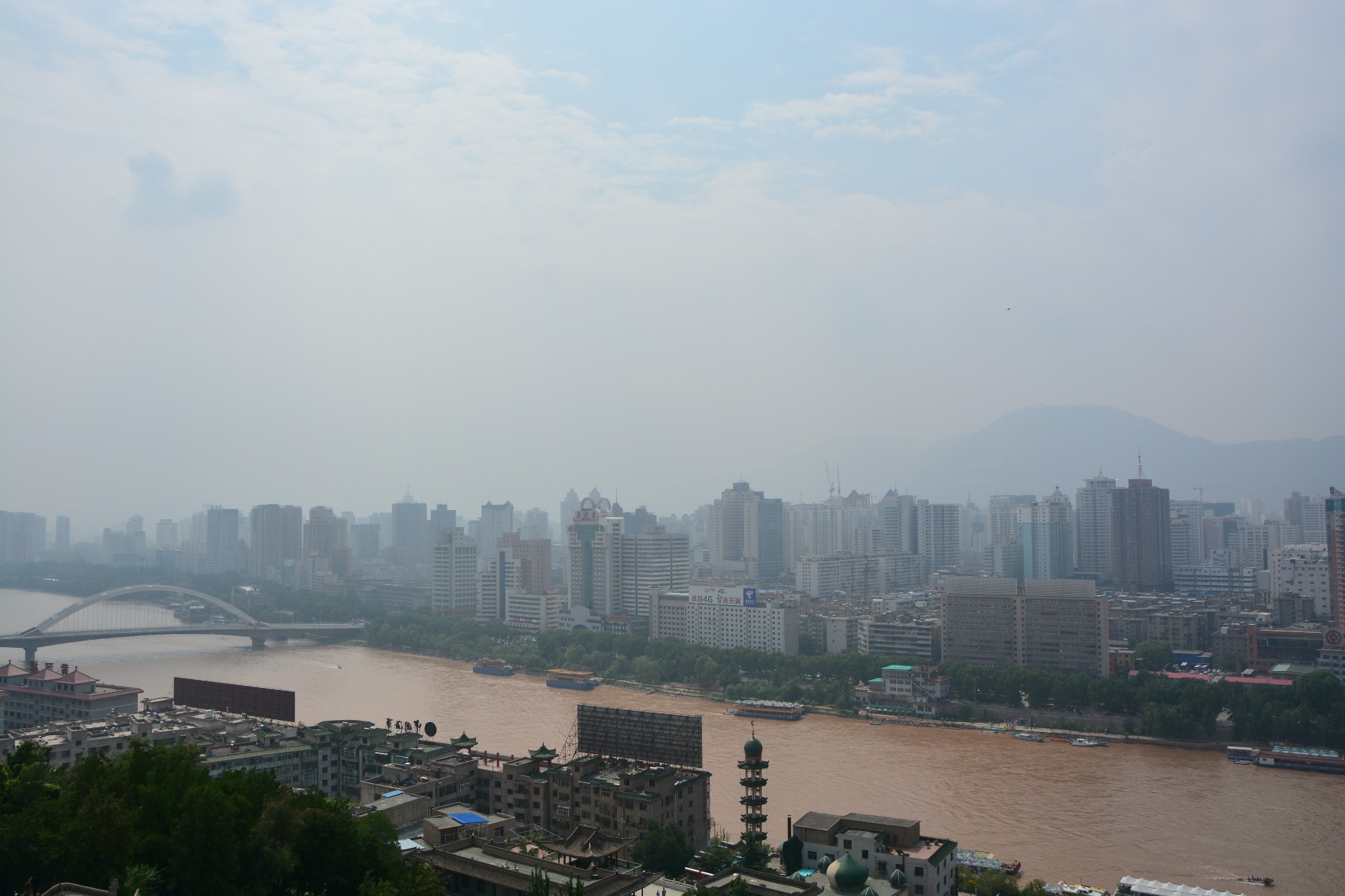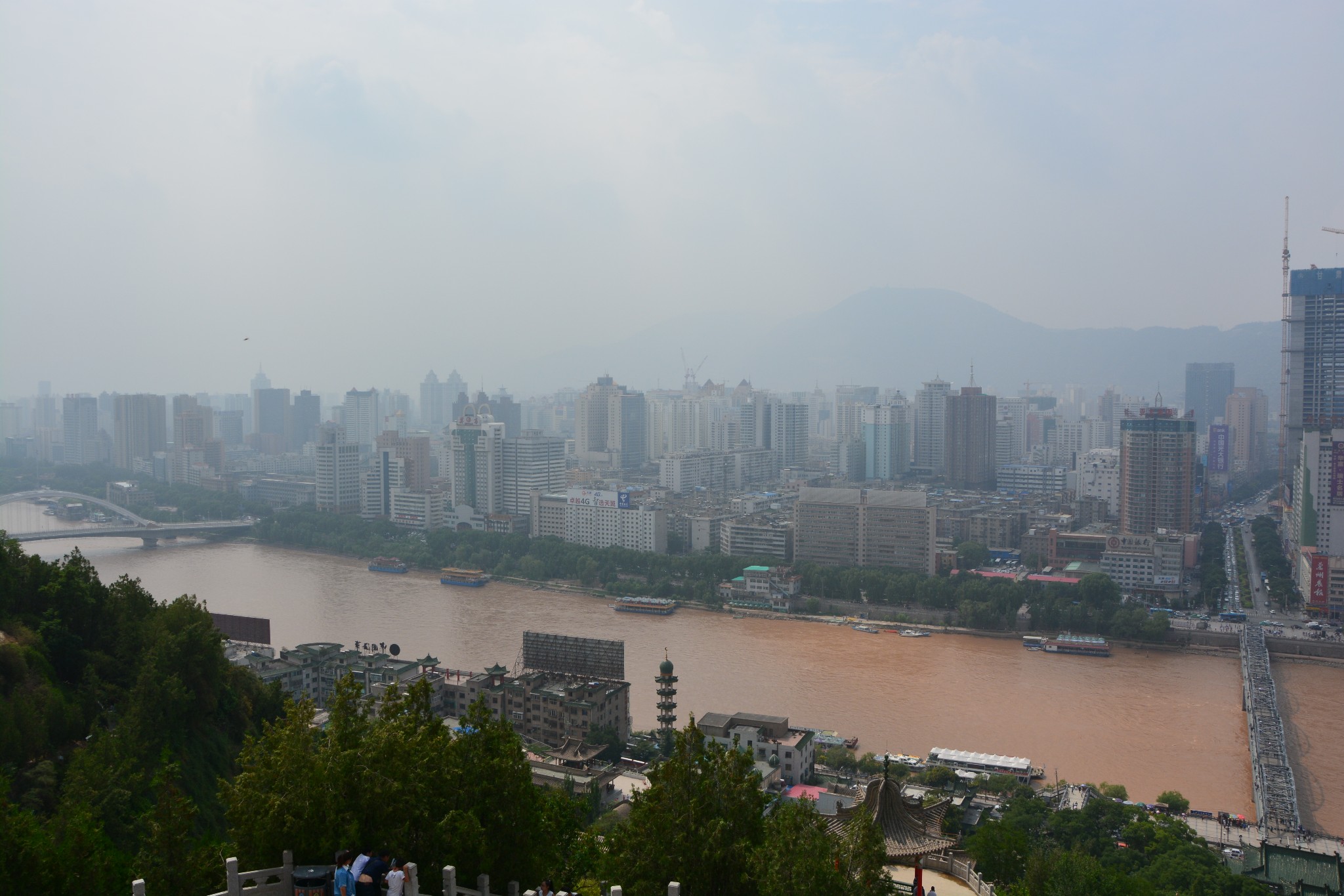 登上宝塔山顶,可以俯瞰黄河两岸的兰州市容,浑浊的河水静静流淌,铁灰色的中山桥如同一根坚实的臂膀,默默搭在河上,一派雄浑壮丽的景象。可以负责任地说,从此处望出去,应该就是整座兰州城内最好的景色了。