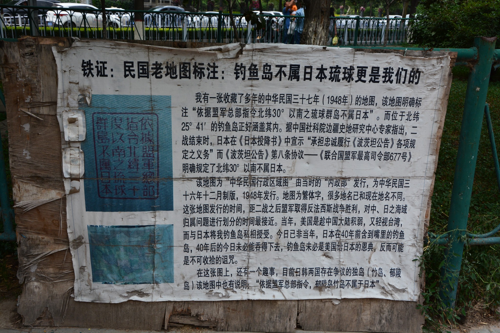 离开水车园,在走去黄河母亲像的途中,偶然看见路边张贴的告示,正是所谓“铁证:民国老地图标注:钓鱼岛不属日本琉球更是我们的”。其实在我看来,与某国争辩钓鱼岛到底属于谁根本没有任何意义,我们身处的原本就是一个弱肉强食的世界,当我们拳头够硬时,钓鱼岛就一定是我们的,当我们的国力衰弱时,莫要说小小的钓鱼岛,就算是其他核心利益也休想保住,外蒙古、海参崴、台湾、香港,哪一个不是活生生的例子和血淋淋的教训!不管在任何时候,打嘴仗总是一件最无用的事情。
