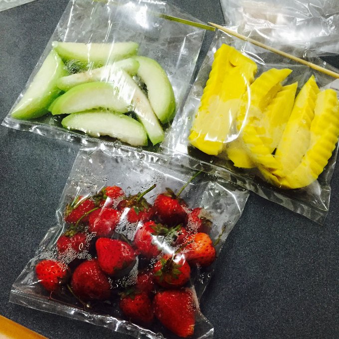 (我们基本都是买这种切好可以马上吃的水果,基本就是10-20铢一袋,你们一定一定一定要吃泰国的莲雾!超级清甜!其他的新鲜水果随便挑。但是要注意看清楚像上图右上角的那个芒果就是腌制的,个人不是很喜欢,看大家的口味如何)