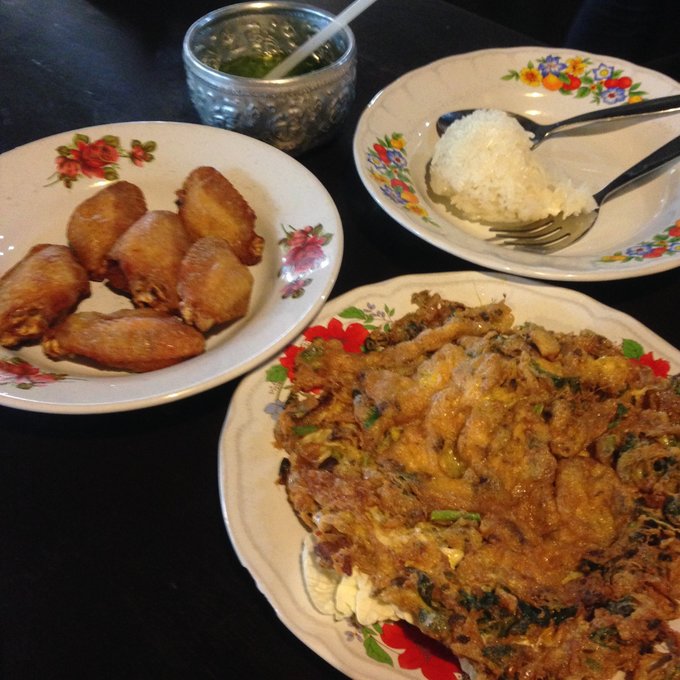 (一开始以为右下角这个是网上介绍的香蕉花炒鸡蛋,但是好像不是,这个蛋就是menu封面的那个,反正也好ci。没什么泰国特色的鸡翅也好吃。再加一个糯米饭棒棒哒~泰国的糯米饭真的值得一试)