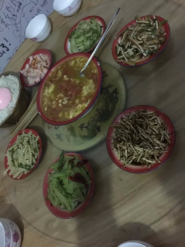 深夜晚餐,谢谢邓军长,最右边那一盘是折耳根,不知道你们吃过没~~番茄鸡蛋汤超美味