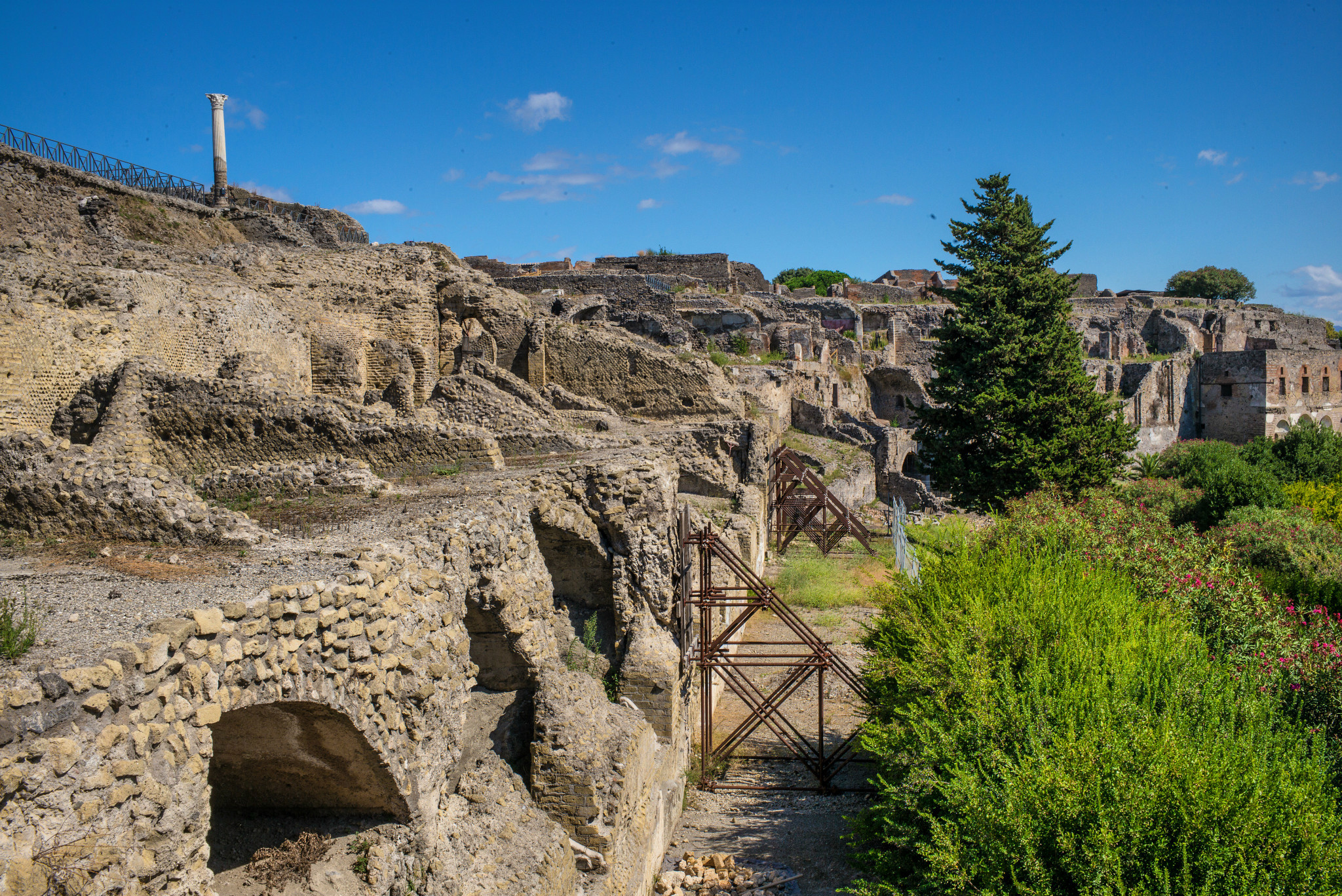 古城挖掘始于1748年,至1960年接近完成。城筑在面积约63公顷的五边形台地上,有长3公里的城墙所围绕,古罗马建筑物、工艺品及其他生活遗迹保存完好,为研究古罗马社会和历史提供第一手资料。著名的游览地。