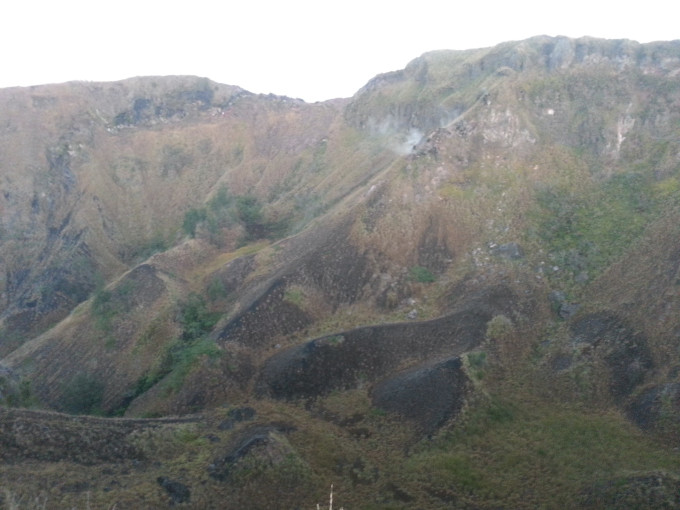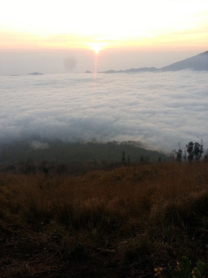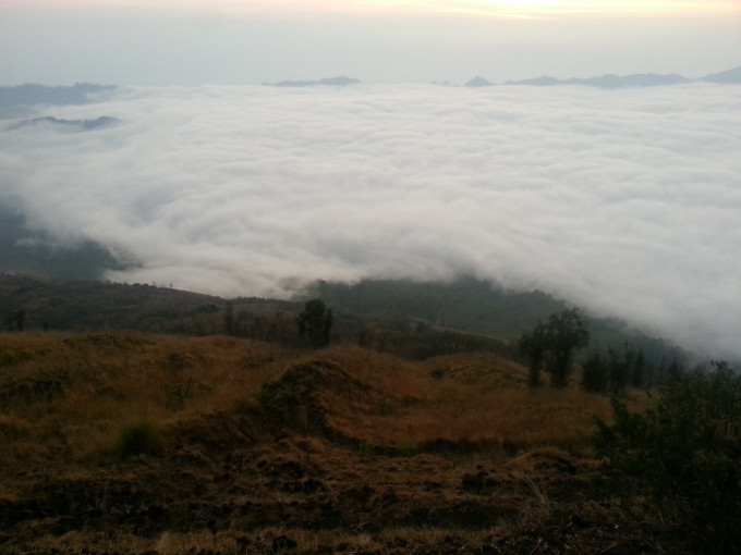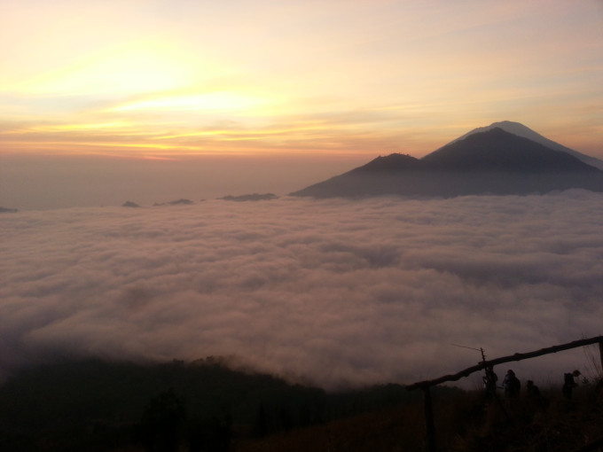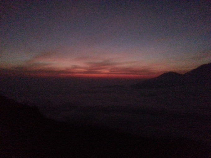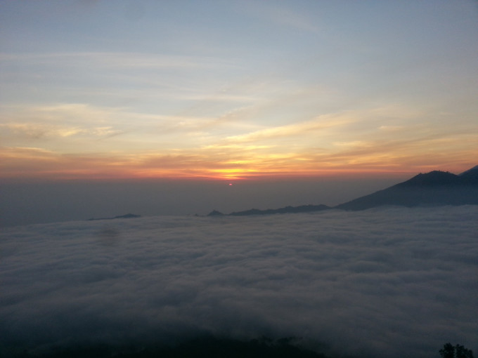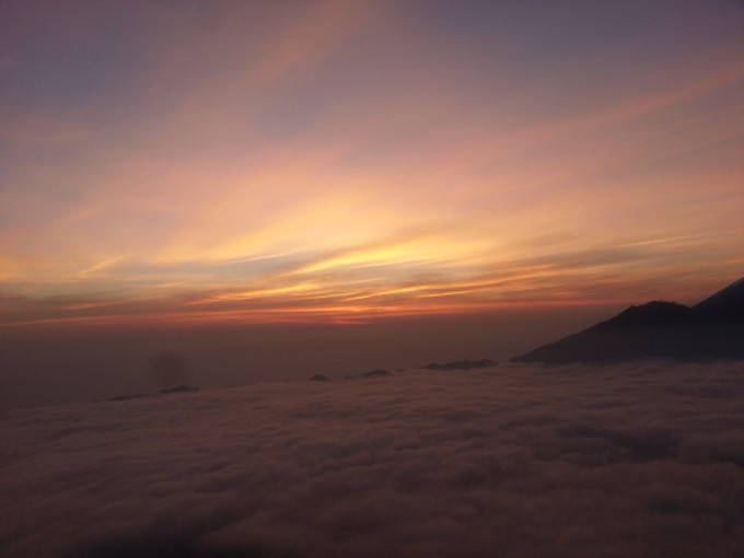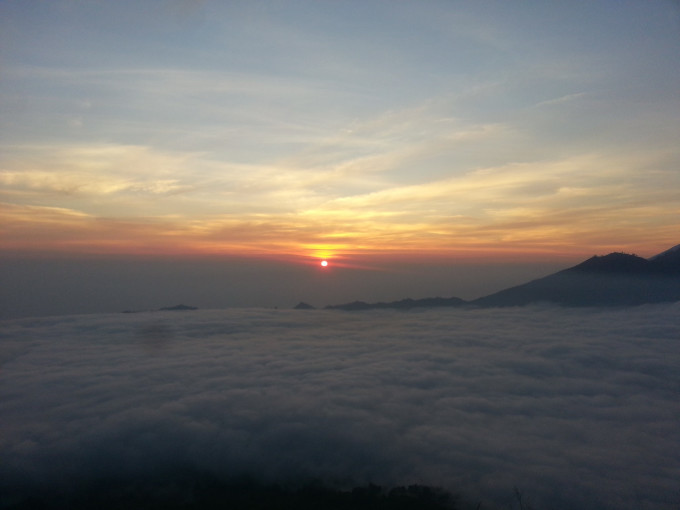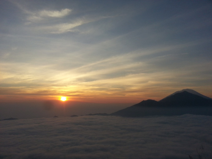 从画廊出来已经傍晚时分了,想到今天在乌布好像什么地方都没逛,便报了一个团,凌晨2点出去巴图尔火山。旅行社没有留我的电话,担心睡过头错过PICK UP,几乎一夜未眠。2点半左右,坐满一车欧洲人的车最后来接我了,我们一组7人,2人法国,4人德国,1人中国。司机开了一个多小时,在山脚下停下,带我们去吃早餐。所有旅行团的人都集中在这里用餐,吃了简单的煎饼,喝点咖啡喝热茶,便再次出发去登山。来到山脚下,温度骤降,我穿着抓绒的风衣还是觉得冷,迫不及待想登山了。有两个导游负责带我们这个小组,他给我们各发了一个手电筒,就开始上山了。一开始是乡间小路,然后是山路,再到踩着火山石往上爬,最后深陷在火山灰中,走两步退半步,直到登顶。上次爬林贾尼火山,感觉西方人都很有优势,腿长脚长的,一会就在前面不见踪影了。而这次在百图尔火山遇到的西方人,尽管还是腿长,但走一会就要歇一会,眼看太阳快出来了,我着急地想离队了,但负责人的导游不同意我先走。后来那对情侣在第一个观景台就停下来了,而我们几个继续走到最高处才驻足欣赏。