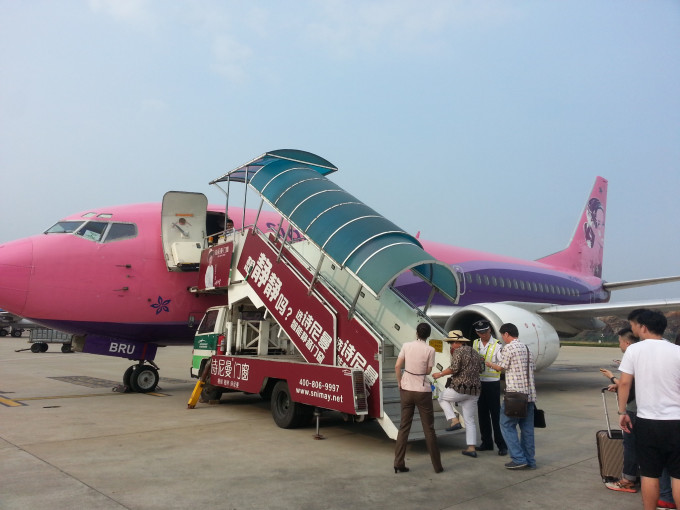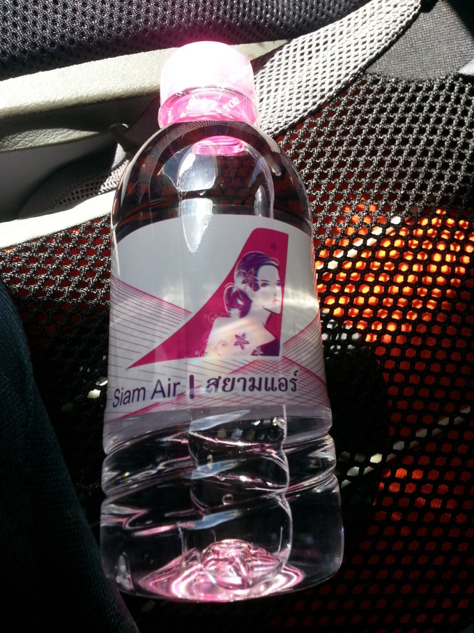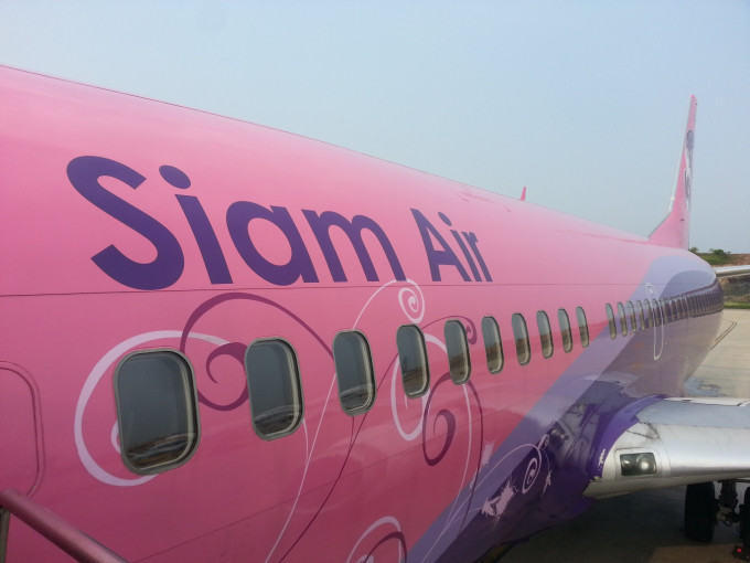 经过这么一个晚上的折腾,旅客们情绪都很低落。直到接驳巴士送我们来到暹罗航空的飞机前,巴士里的人们开始骚动了。这是一台女性化十足的飞机,粉色的外壳,LOGO是一位挽起发髻的女性。我的心情也被点亮了,但仍然不能不担心接下来的转机。于是我跟空姐说明了情况,那位空姐看了我的行程单,惊呼时间的紧迫,但还是很爽快地答应帮我解决问题。我看她雷厉风行地先去通知机长,然后打电话给曼谷的地勤,最后告诉我会有人带我及时赶上飞机的,我觉得把事情交给她相当放心。