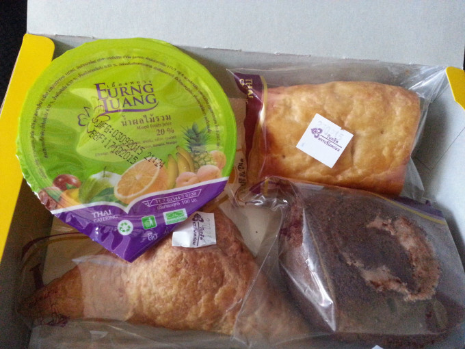暹罗这航空公司,貌似把凌晨1点,3点和5点这三个航班的客人都集中在一架飞机上,但座位还是很空。我一个人独占了整个第二排,能以在飞机上踏踏实实地睡上一觉。等我醒来,发现贴心的空姐把早餐和水放在我身边,并没有叫醒我,也许是叫不醒