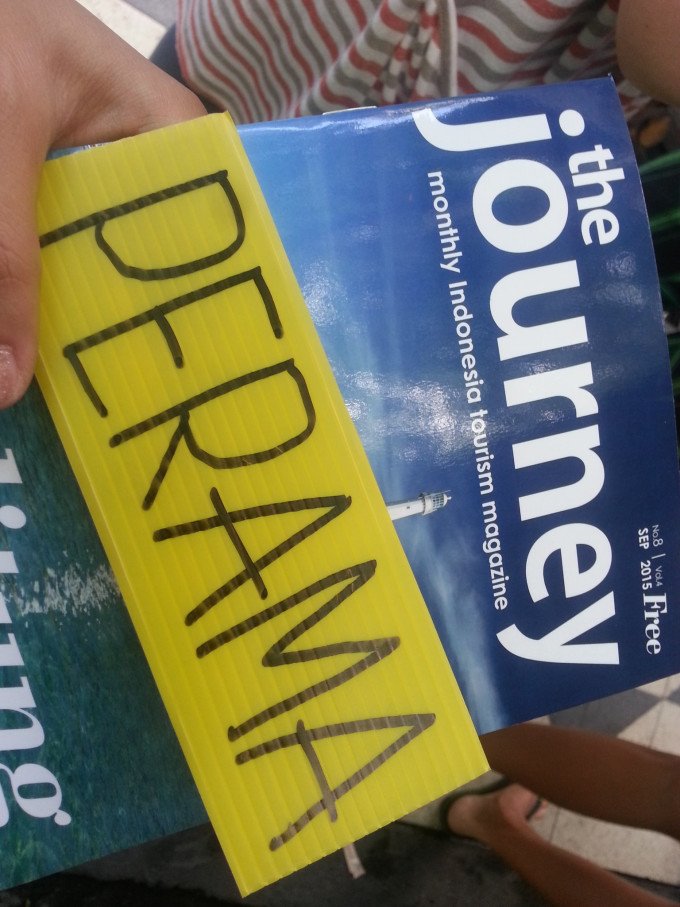 工作人员发给我一个黄色的牌子,拿这个牌子的是去乌布的,还有拿红色牌子的则是去其他方向,这样很方便他们管理。柜台上有免费小册子可供阅读,这本小册子很实用,有巴厘岛和龙目岛的地图,有库塔、吉利岛等小地方的地图,有景点信息,还有一些常用的印尼语。我天天拿着这本小册子练习,终于学会说几句了。