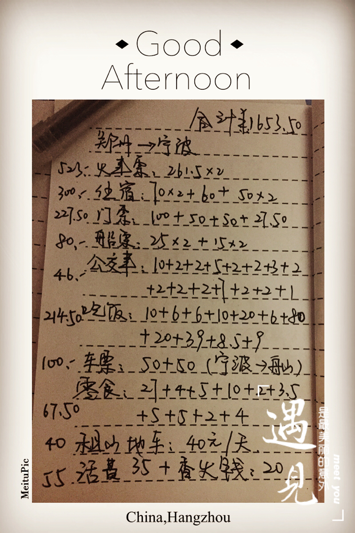 2015年国庆郑州至宁波六天七夜一个人的背包之旅自由行,所有衣食住行一共消费人民币约1653.50元,明细如下……09.30-10.01郑州-宁波-舟山-朱家尖,10.02朱家尖-慈航广场-蜈蚣寺码头-普陀山-佛顶山-蜈蚣寺码头-慈航广场-朱家尖,10.03朱家尖-佛学院-月岙-朱家尖,10.04朱家尖-大青山-南沙-情人岛-东沙-乌石塘-佛学院-朱家尖,10.05朱家尖-舟山墩头码头-桃花岛-安期胜境安期峰-圣岩寺-桃花岛码头-舟山东港贸易城-朱家尖,10.06朱家尖-舟山沈家门(普陀站,城北车站)-宁波,上火车,➡️10.7 06:50郑州-回家。行走81.06公里,148285步,预估环岛骑行50公里,没有码表,招手搭车20公里。学生证门票半价节省177.50元。哈哈哈哈,每次出行总结,我都觉得我好厉害,这次带的现金都还有一半儿,住宿都使用微信给阿哲老板发红包了,真方便……你是不是很心动下次跟我一起出行啊?那就先从每天坚持10000步做起吧,我还可以考虑考虑……刚刚去哪儿网站客服给我打电话住宿返现35核对银行卡信息,又节省35块……1618.5……
