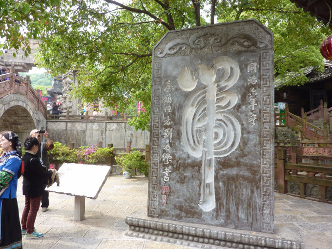 这根石柱耸立在土家风情园的中央,高12米,直径为1.2米,这上面还用一笔连成的鲁班文写着【汇集武陵精神,传承土寨风情】十二个大字。