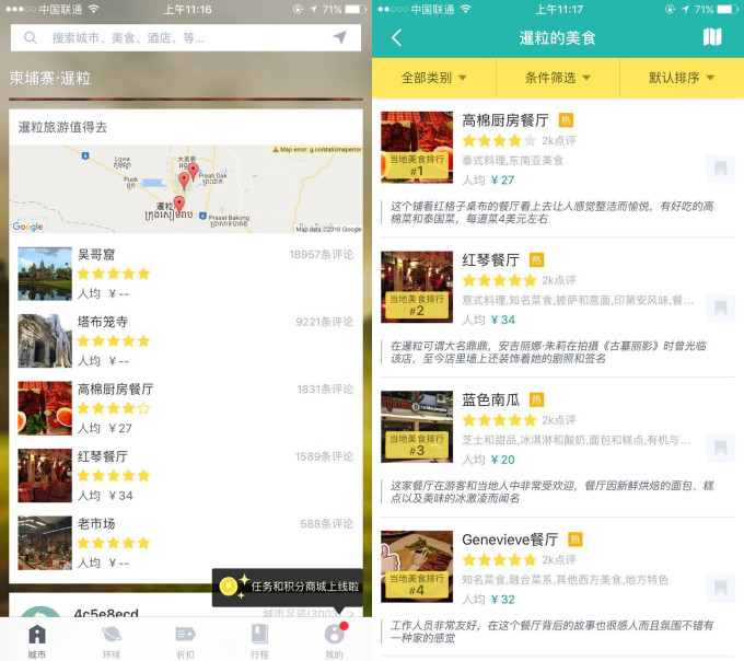 这个app上不仅有国外的美食、酒店、景点、商场信息,最最重要的是有非常多的游客点评,比如吴哥窟,点评已经快2万条了。到了国外可以根据所在的位置找到附近的吃喝玩乐,只要有网不怕找不到好吃、好玩的,推荐给自助游的朋友!App里还有购物优惠券,去了国外的商场和免税店,都可以用,柬埔寨没啥好剁手的,要是去隔壁的泰国一定要用上,听朋友说能省下不多钱!