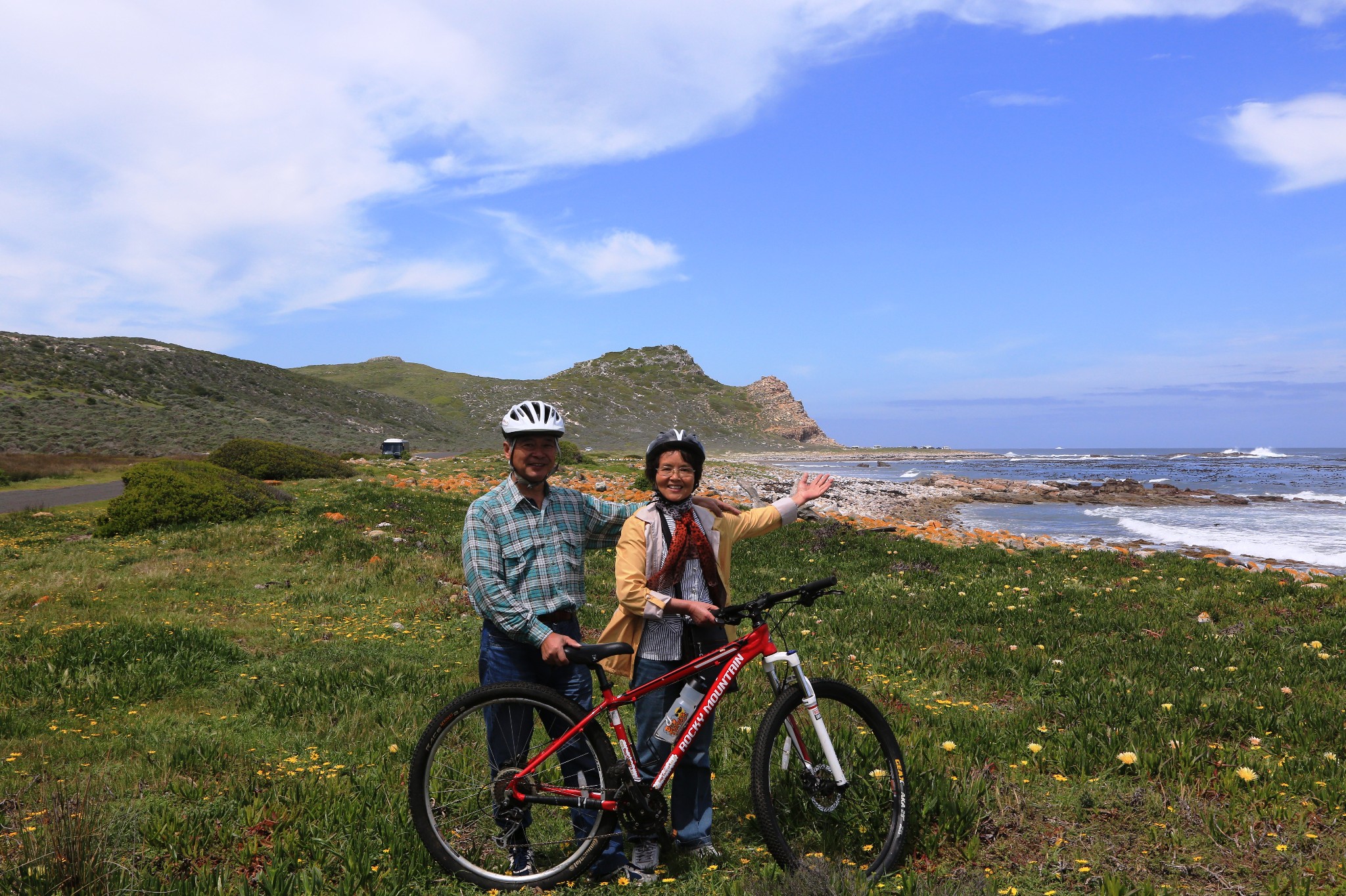 骑自行车游览好望角,可以随时下车观看景色,非常爽,我们老两口也在这里留个纪念。