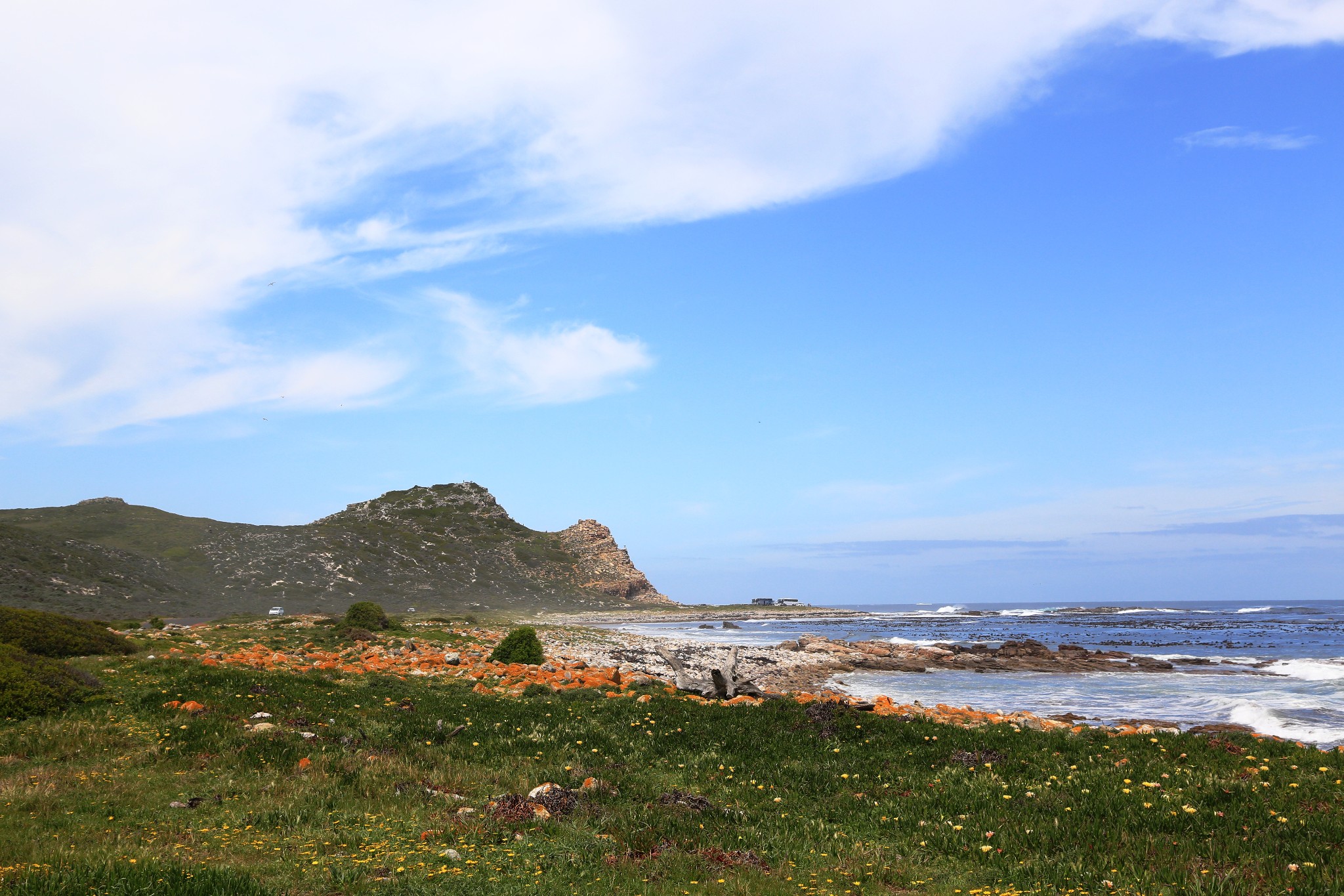 进入好望角山区,都是一些灌木丛,很少看到大树,仅仅看到图片中间的二栋小平房。好望角又是一个植物宝库,这里几乎拥有全世界最古老、完全处于原生态的 灌木层,有从来没有受过人类干扰的原始植物群,拥有研究植物进化不可多得的原始条件。