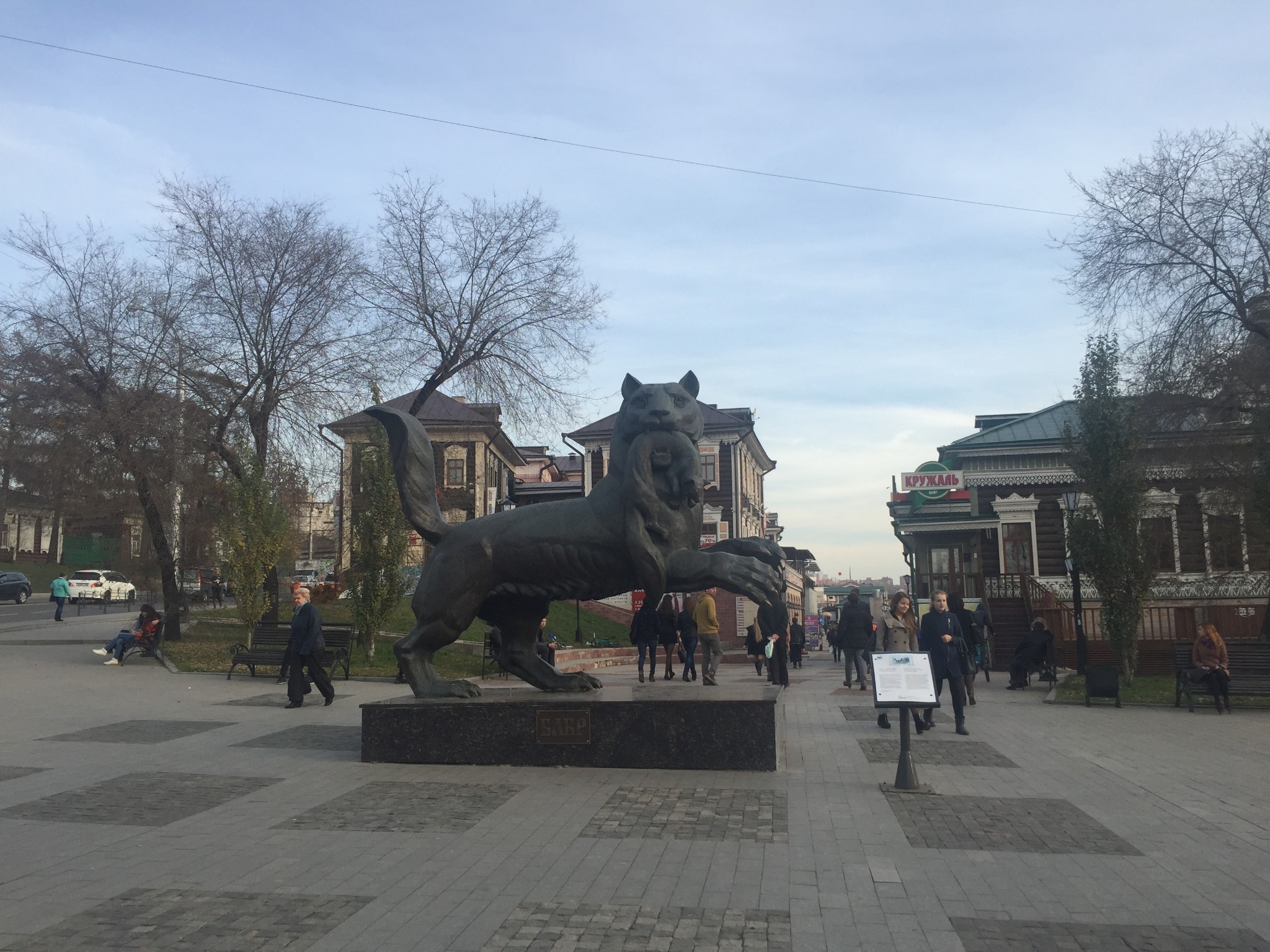 我们边走边玩,第一站来到了步行街。进入步行街前,映入我们眼帘的首先就是上图。一个似虎的神兽,口衔一只紫貂。这个图案以后你会经常看到,它是城市的标志。代表着力量和富裕。携带火器的俄罗斯人征服了当地的土著民族,依靠向东方销售貂皮,大发其财。这也是为什么遥远的强悍俄罗斯民族,后来居然成为了我们的北方邻国的原因。