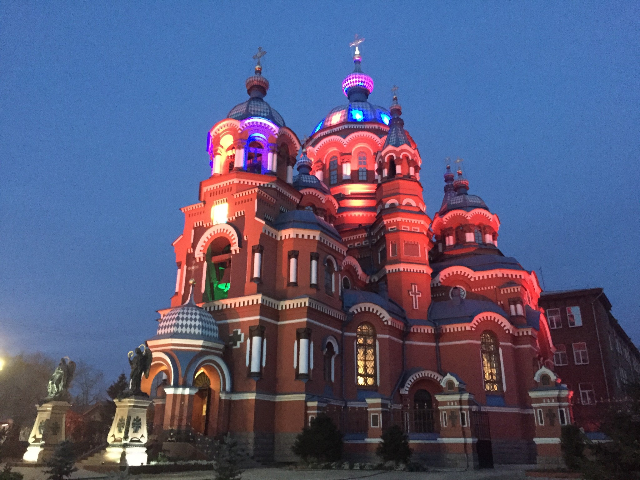 就这样,我们来到了第三站,喀山大教堂。大教堂异常漂亮,红砖外墙在灯光的映射下宛如童话里的建筑。由于东正教兴起于君士坦丁堡,来自于东方,因此其教堂相较于西方的罗马天主教堂,就显得更加瑰丽璀璨和丰富多彩。