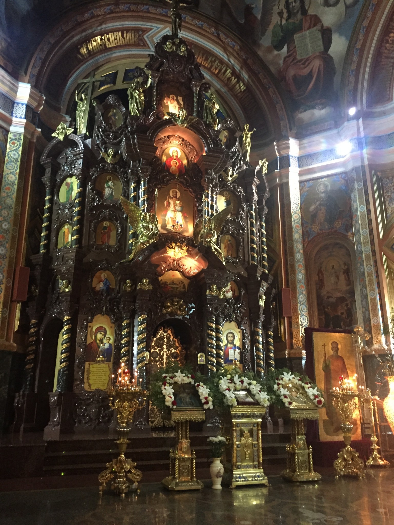 教堂内部十分安详,一位神父和修女正在吟唱圣歌,歌声空灵悠扬,让人久久不愿离去。一位女士站在一处花篮的地方,把脸几乎埋在花中,默默祷告着什么。也许是在述说生活中的种种烦恼,也许是在为自己的某些所作所为而深深忏悔,以求得心灵的平安。不管你是否信仰东正教,只要你走进来,你会对这里供奉的神灵肃然起敬。也许,这就是宗教的魔力。