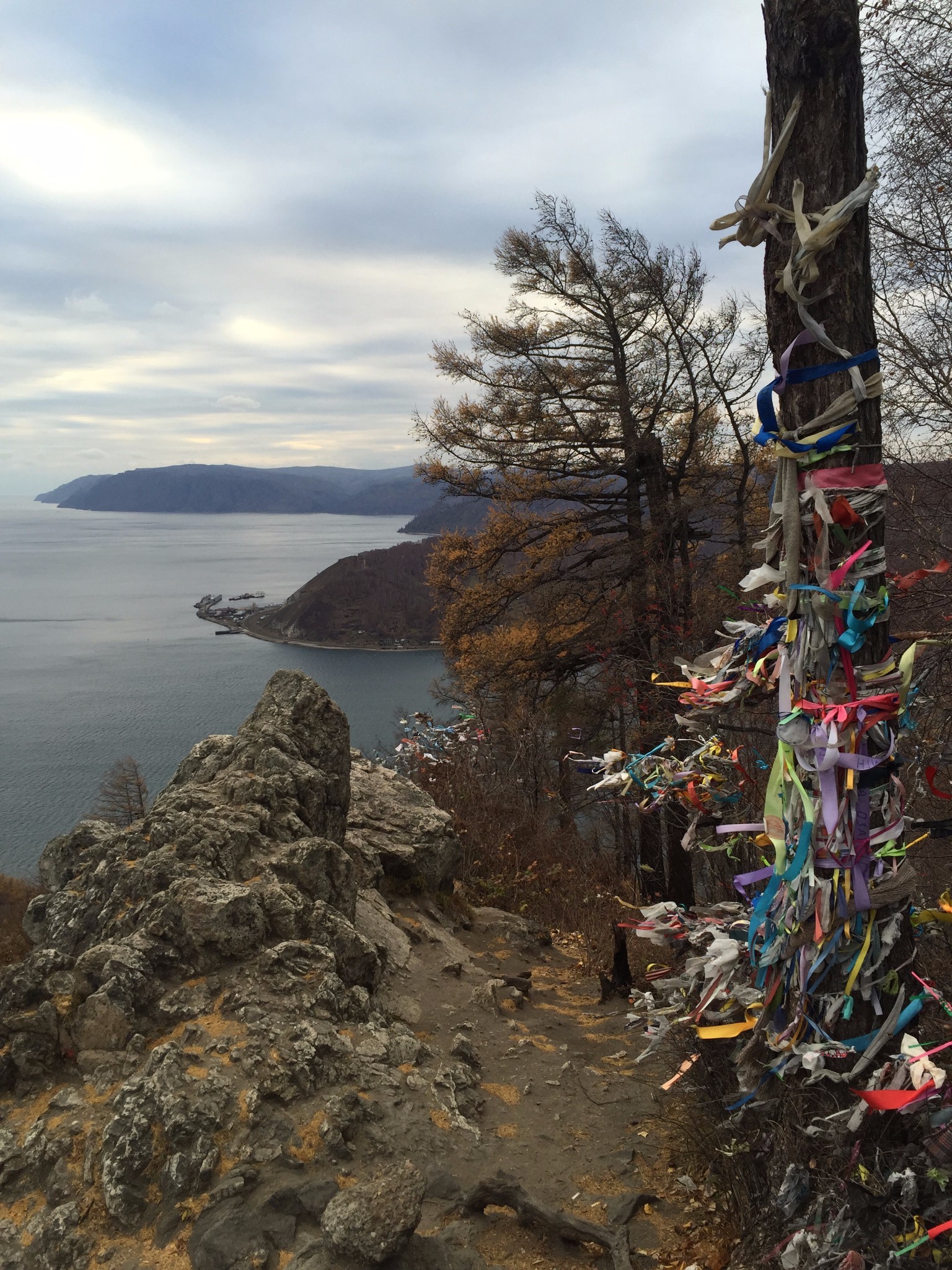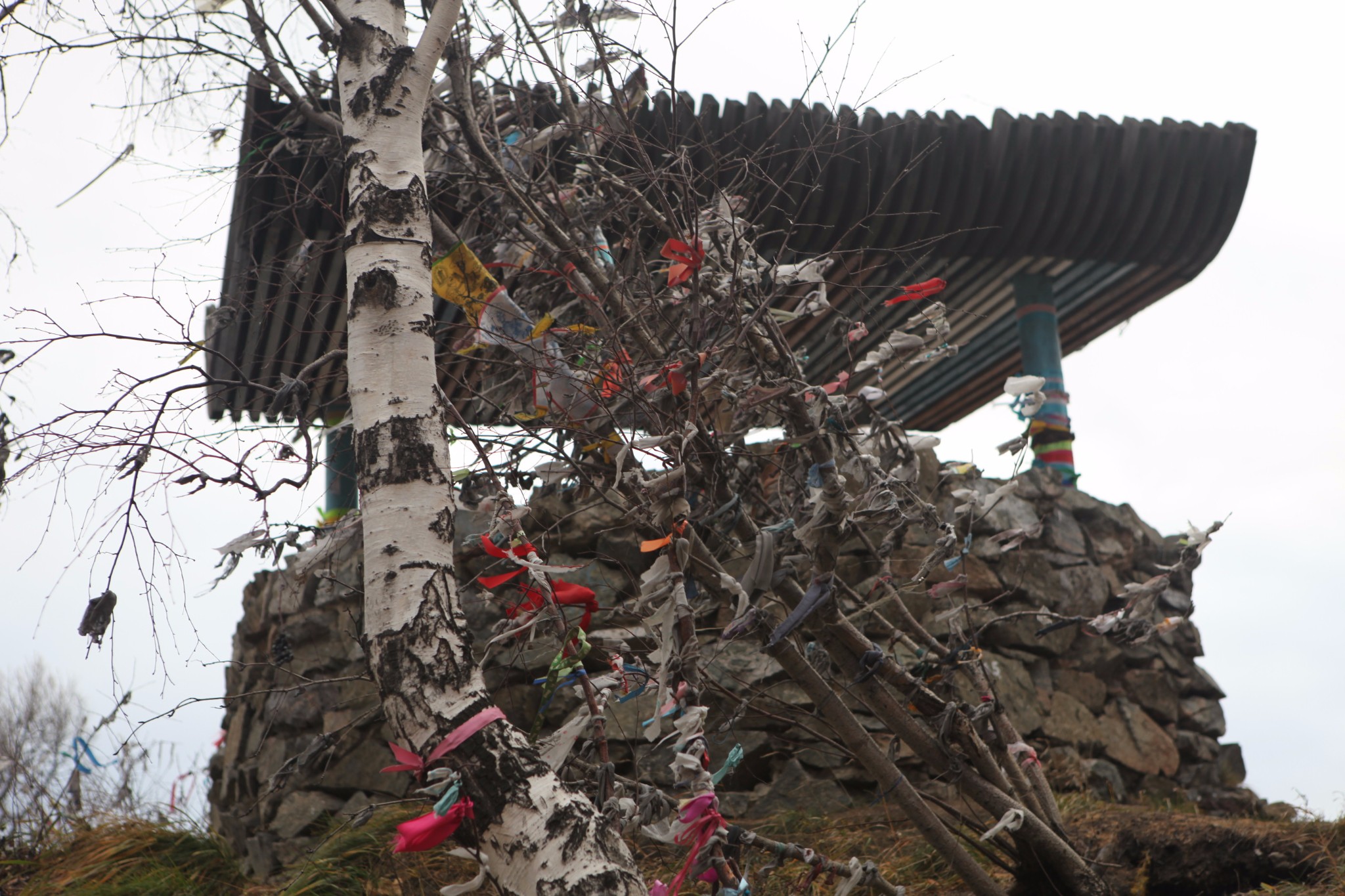 这个地方冬天是一个滑雪场。我们乘坐缆车抵达山顶。在这里可以向西远观落日,向北遥看下榻酒店。向上再走不远,就能看到一座小亭子,周边树上、栏杆上绑着祈福的彩条。在河口中间,有一块石头突起。据说那就是萨满石,充满着能量,可以给人类带来福祉。小亭旁高高耸起的岩石大概就是Stone Cherskogo了,顶端还有人码放了硬币,希望带来好运。