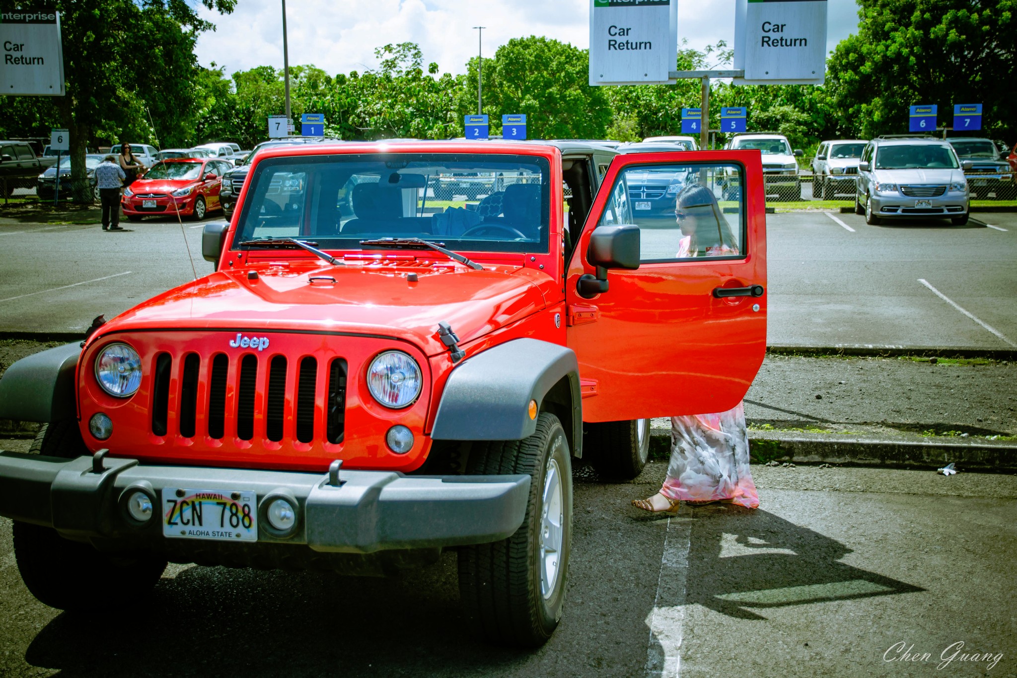 和传说中的一样,Hilo很多雨,感觉时不时就会下一点点雨来”调节“一下氛围似的。我们从机场出来,就直奔租车预约的地方,租车离机场非常近,走两步就到了,确实蛮方便。我们这辆车是和costco提前说好,他们让租车公司Alamo特地从Kona调过来的吉普牧马人。我一眼就看到了这一辆红色的牧马人!LP也很喜欢这辆,于是赶快去柜台把这辆车拿到手,还真是最后一辆红色的,哈哈!