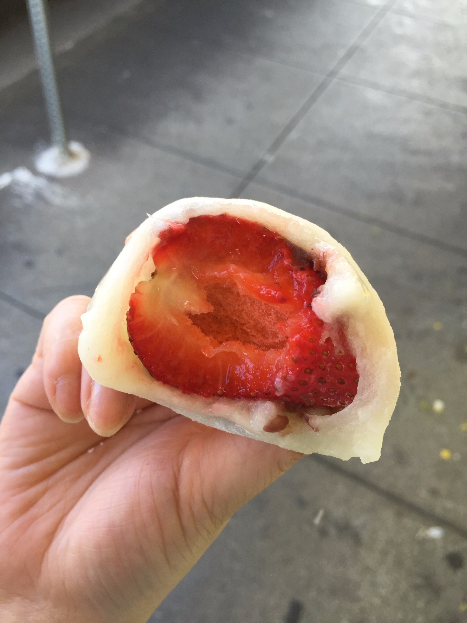 遇到店主,一个很nice的日本阿婆,介绍最好吃的是草莓麻薯,可惜的是这个麻薯要保持新鲜,不能放太多时间,更可惜的是,因为是新鲜水果,不允许带到美国本土,所以没办法当做礼物送朋友。。。想吃的只能来本地吃了。。。