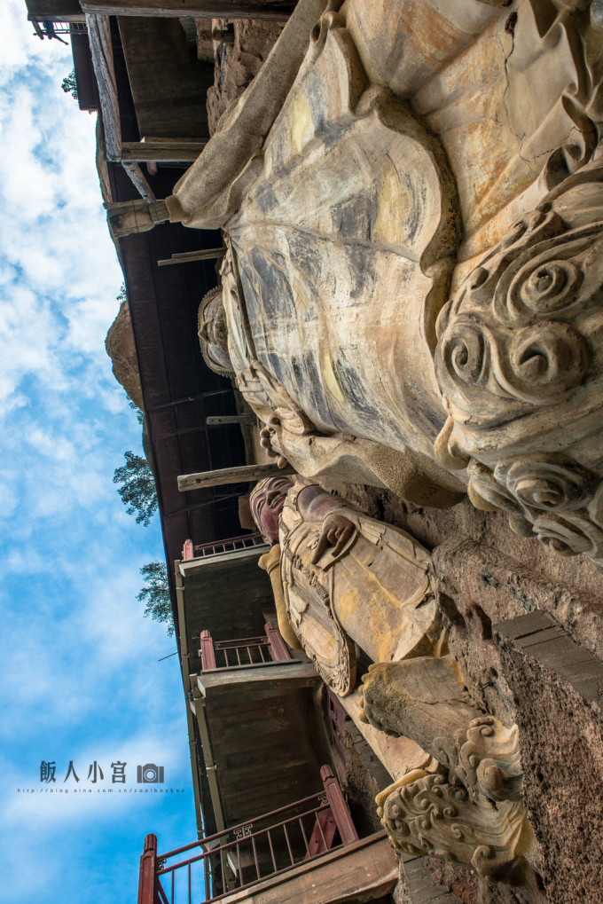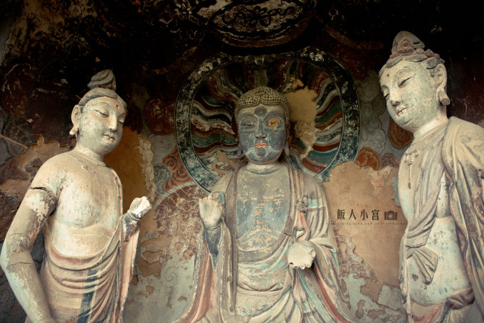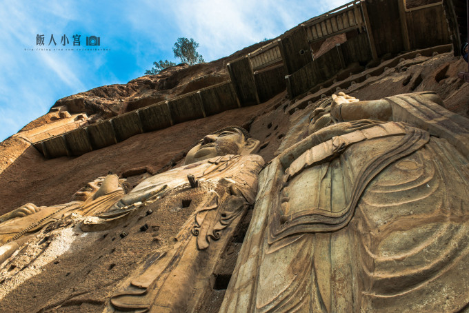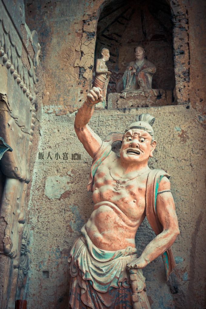 来天水的人,多半是为了去麦积山石窟,虽然不比龙门、莫高、云冈那么出名,但它可是与这三位并称“中国四大石窟”的。从麦积区火车站前往麦积山石窟,公交20分钟即到。尽管从网上已经看过麦积山石窟的样子,但它真正出现在我眼前时,是完全不一样的感受:在一座坑坑洼洼,似经过枪林弹雨的山体上,被雕琢了数座巨大的佛像,佛像面朝蓝天,表情肃穆祥和,四周是密密麻麻、大小不一的小石窟,修筑的十几座石阶将整个山体上的石窟、佛像链接起来,游人可以攀登上去参观。