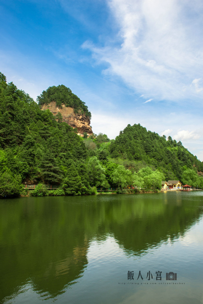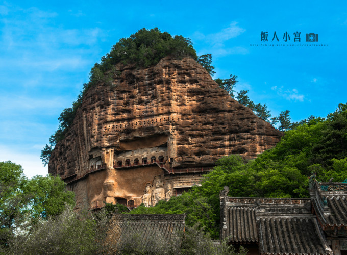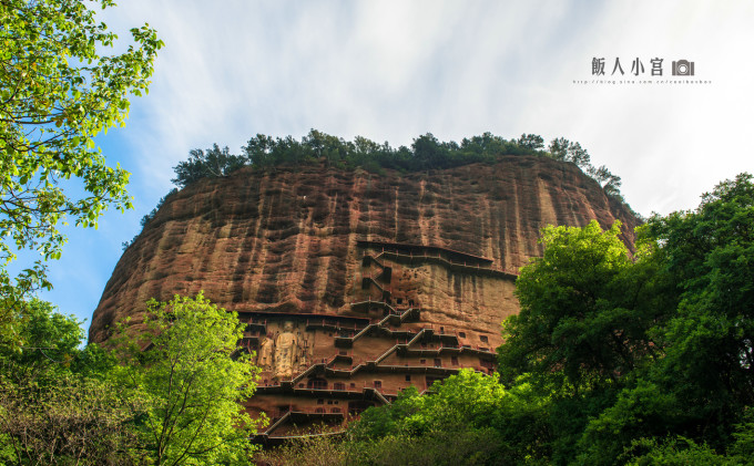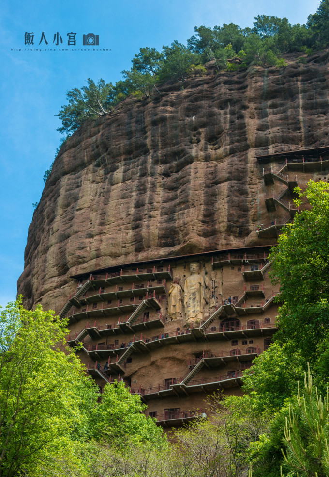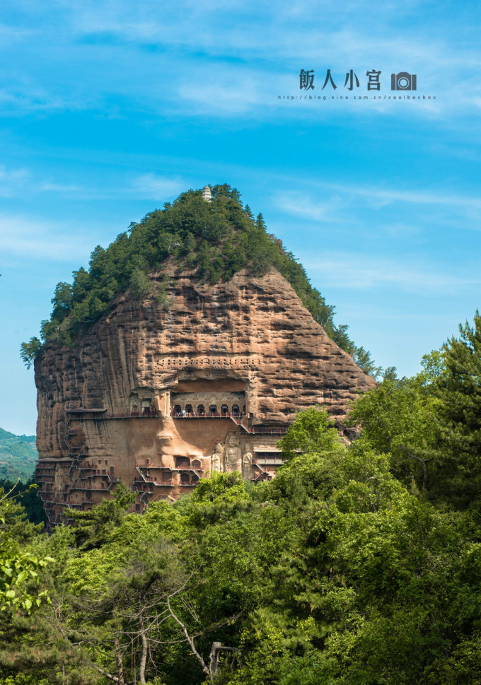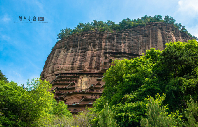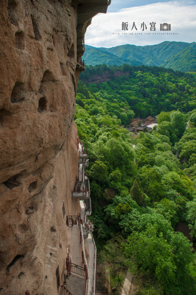 下山后继续向前,途径植被更丰富的植物园区,路上有一处观景台,是欣赏麦积山石窟全貌的最佳点,到这里才发现,原来山顶上还有一座白色的小塔,在湛蓝的天空以及如流水般的白云衬托下,石窟倍显沧桑,古代工匠们巧夺天工的技艺一览无遗。