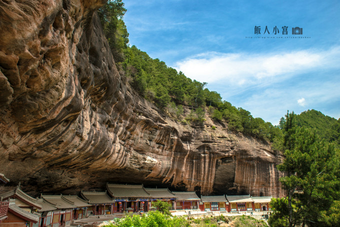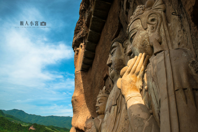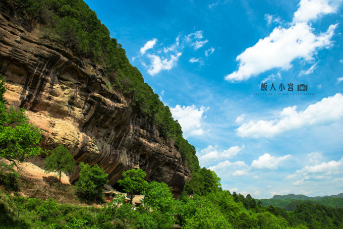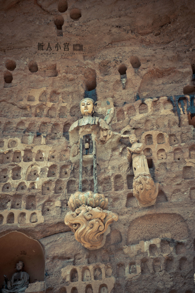 仙人崖的山体、植被与麦积山相似,不同的是这里的山下,保存着很多寺庙,在突兀的崖体之下,藏有他们沧桑的身影,崖壁之上,亦有诸多佛像石窟,其中以南崖的千佛壁最为出名,千百个小石窟从远处看似马蜂窝一样,残破不堪的佛像依旧保持着那份肃穆。