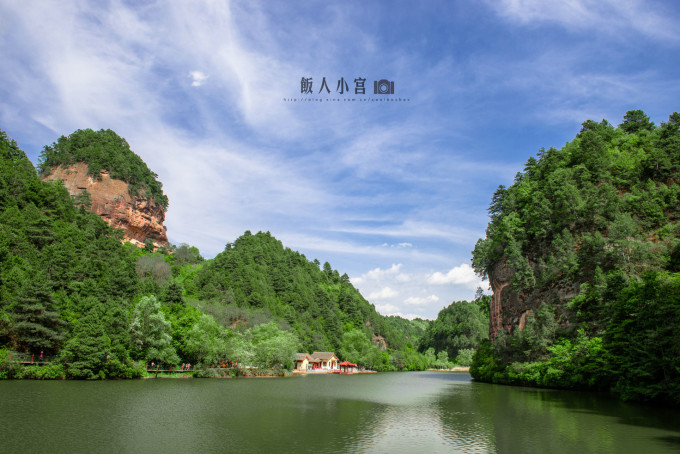 最精彩的景致,是在出口附近的桥上,在这里,天、地、山、水,完美的相融:清澈的湖水将蓝天白云映在怀里,赤红的丹霞石和繁茂的绿色植被是那样的养眼,蓝天白云则不停的变换着自己的身姿,吸引着像我一样的摄影者不断的按下快门。此刻,真怀疑自己是否身在西北之地,眼前是塞上江南一般的好山好水,而想象中丝绸之路上大漠漫漫、黄土连绵的场景似乎远在天边。