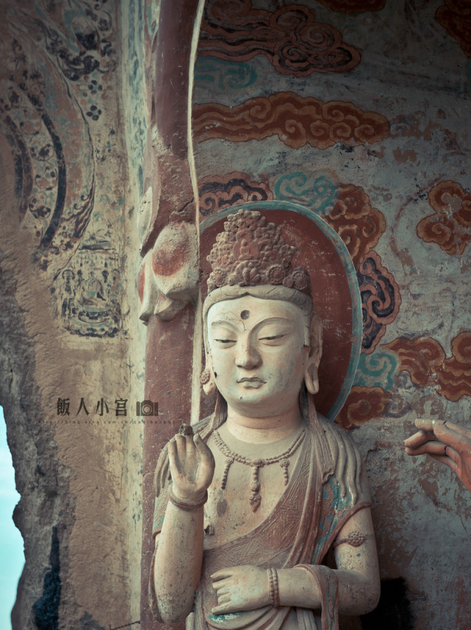 如果来的早,山上几乎没人,可以静下心细细观看。这里的石窟佛像与以前去过的龙门、云冈石窟有较大区别,它们均是以泥塑做成,色彩更丰富,以红、橙、土黄、墨绿为主,表情动作很丰富,像飞天佛像这样的造型还是首次见到。山中间部分是最大的佛像,由于角度关系,只能从佛的脚下仰视,大佛面向和蔼,双眼直视前方,冥冥之中有一种无形的威严。攀登至最高处,远眺群山,整个麦积山地貌尽收眼底,被大面积绿色植物覆盖的山体,让人很难想象这是身处大西北的景致,一座座如馒头一样的小山头,赤红色的山体,与福建武夷山有几分相像。