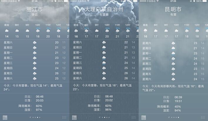 上路之前查了天气,不查不知道,一查吓死狗,totally跪烂膝盖,一周内辗转的三个地方不是雷暴就是雷暴,我觉得飞机能飞已经很不错了。以前倒是见识过丽江的雨季,但尼玛也没有天天雷暴那么夸张,天气预报夸喳夸喳的雷看的小心脏承受不住。