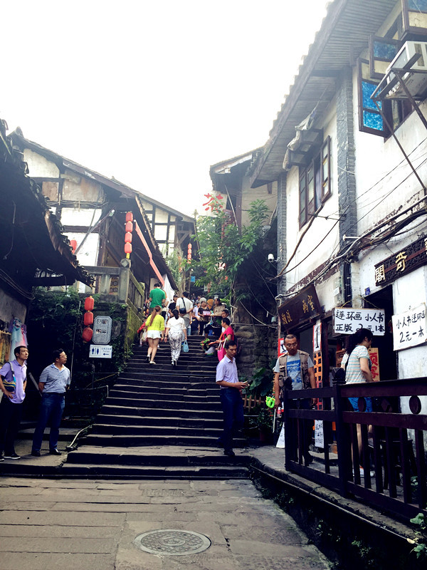 磁器口古镇和中国的大部分古镇真的都雷同化了。刚刚看到的时候与脑中凤凰的印象一下子就重合了。当场觉得有点忧伤。不过逛着逛着,独属于山城的特色还是出现了。那就是地势的起伏。经常走着走着就要开始爬山坡。对于江南人士,虽然多山但是实际一直生活在平原的人来说还是蛮特别的。印象最深的是,我晃了一个下午终于找到一家可以歇脚的咖啡屋,但是咖啡屋是建在悬崖上的。要到咖啡去要爬超过60度的台阶才能到达咖啡屋门口。真的好特别!