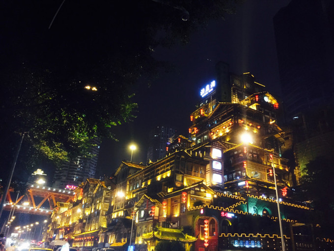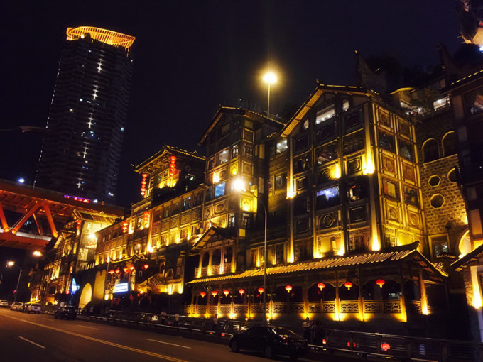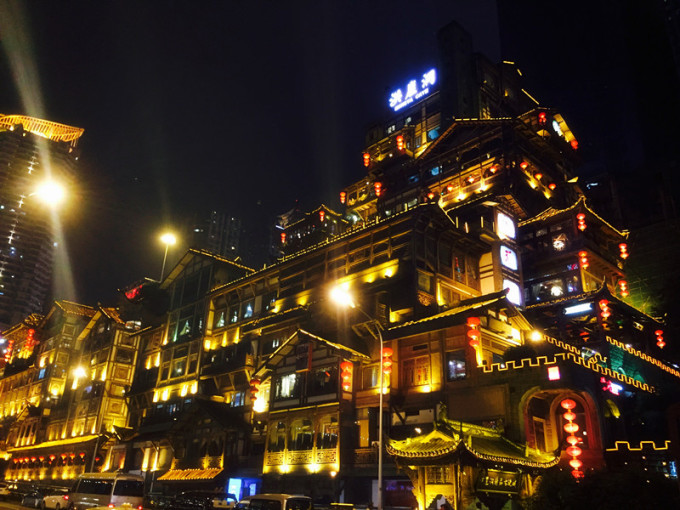 晚上与下午才到达重庆的小单同学相见了。此次我们有不同的旅行计划,只是在重庆匆匆一见。虽然此次没有一起旅行,但是在旅途中遇见也是件美妙的事情。由于我是宫崎骏迷,加之经常在微博上看到洪崖洞是《千与千寻》的现实版场景。就勾得心痒痒。晚上没有吃饭就拉着小单同学直奔洪崖洞而去。洪崖洞是依着悬崖而建的,一共有十一层。从地面一层沿着楼梯一层一层的往上爬,当你爬到第十一层后发现又到了地面。是不是非常奇妙。白天看只是一栋普通的建筑,到了晚上灯光点亮,就真的如同置身于《千与千寻》中一般。好美!
