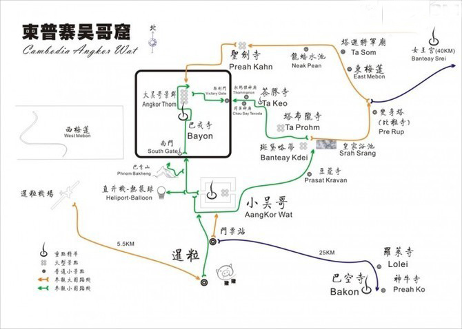 先上一张吴哥景点图,标注了小圈(绿线)和大圈(土黄色线)的游览路线。