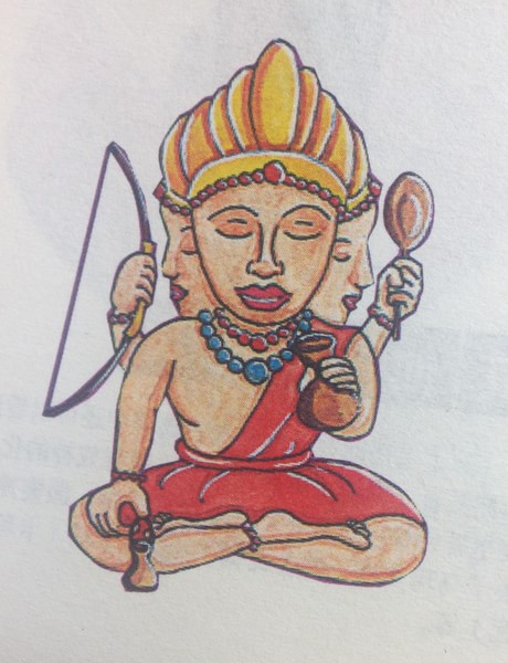 1. 创造之神---梵天(Brahma):他是婆罗门教中的最高神。在印度神话中,当湿婆神和毗湿奴神苦于应对魔王时,他们曾向梵天求助。梵天有四张脸,因此也叫四面佛。还有四只手,手中持念珠、笏、水壶、莲花、弓箭等器具。