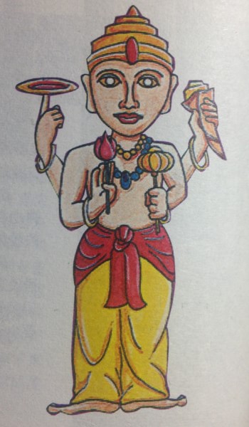 2. 保护之神毗湿奴(Vishnu):他有四只手,分别持有轮宝、法螺、仙杖和莲花。他有时坐在莲花上,有时躺在一条千头蛇身上,有时骑在一只大鹏鸟上。经常和海洋联系在一起。他的妻子是天神和阿修罗一起搅动乳海时出现的,名叫吉祥天女。他下凡救世的故事在印度广为流传,家喻户晓。毗湿奴有许多化身(如鱼、龟、野猪、人狮、侏儒、持斧罗摩、黑天、佛陀),他总是挺身而出救世界于危难。
