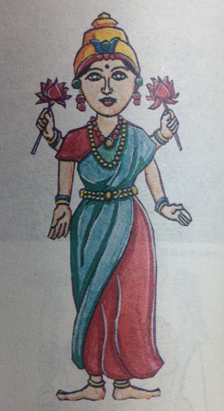 5. 拉克希米:毗湿奴神的妻子,由于其罕见的美,在印度是理想妻子的形象。众神和阿修罗为了求得长生不老之神药,一起搅动乳海而诞生出了拉克希米,拉克希米站在红色的莲花之上,4只手臂分别莲花、瓶子、毗鲁瓦的果实和法螺等。