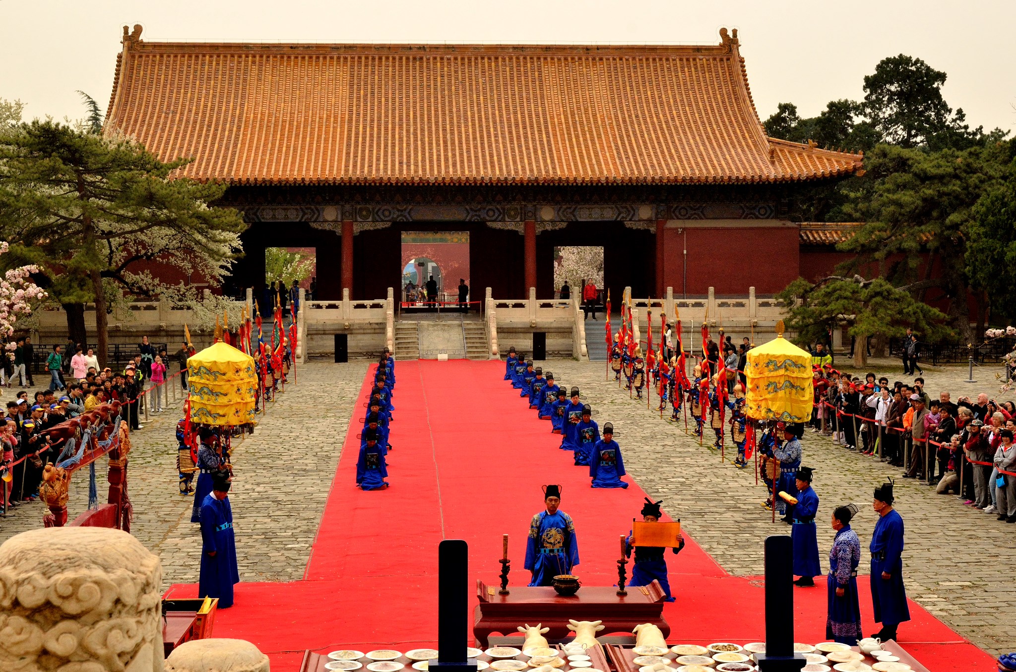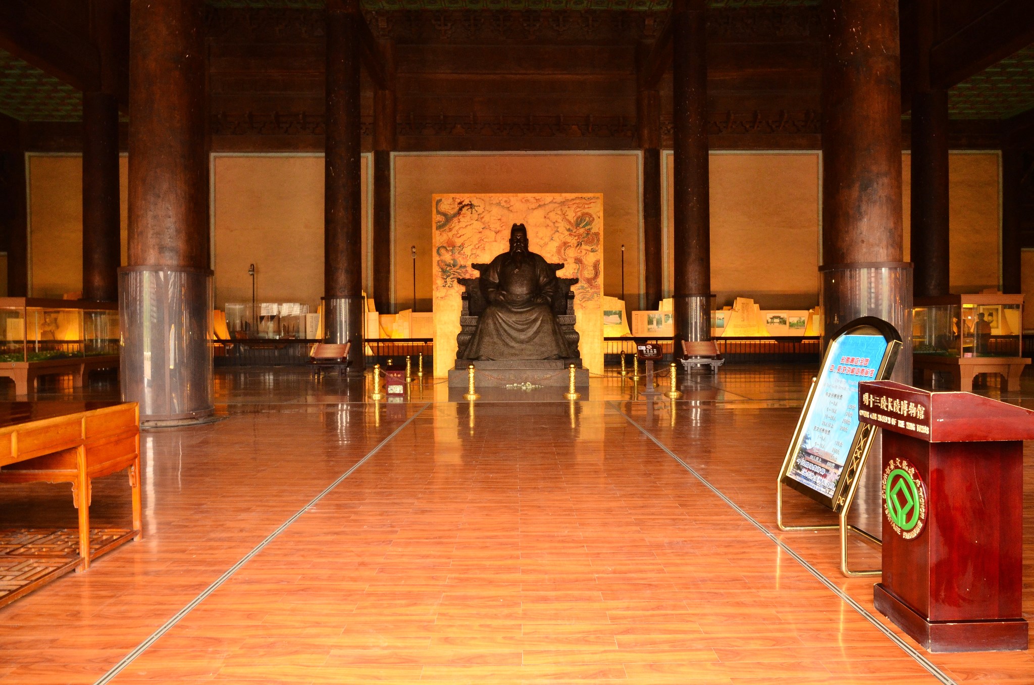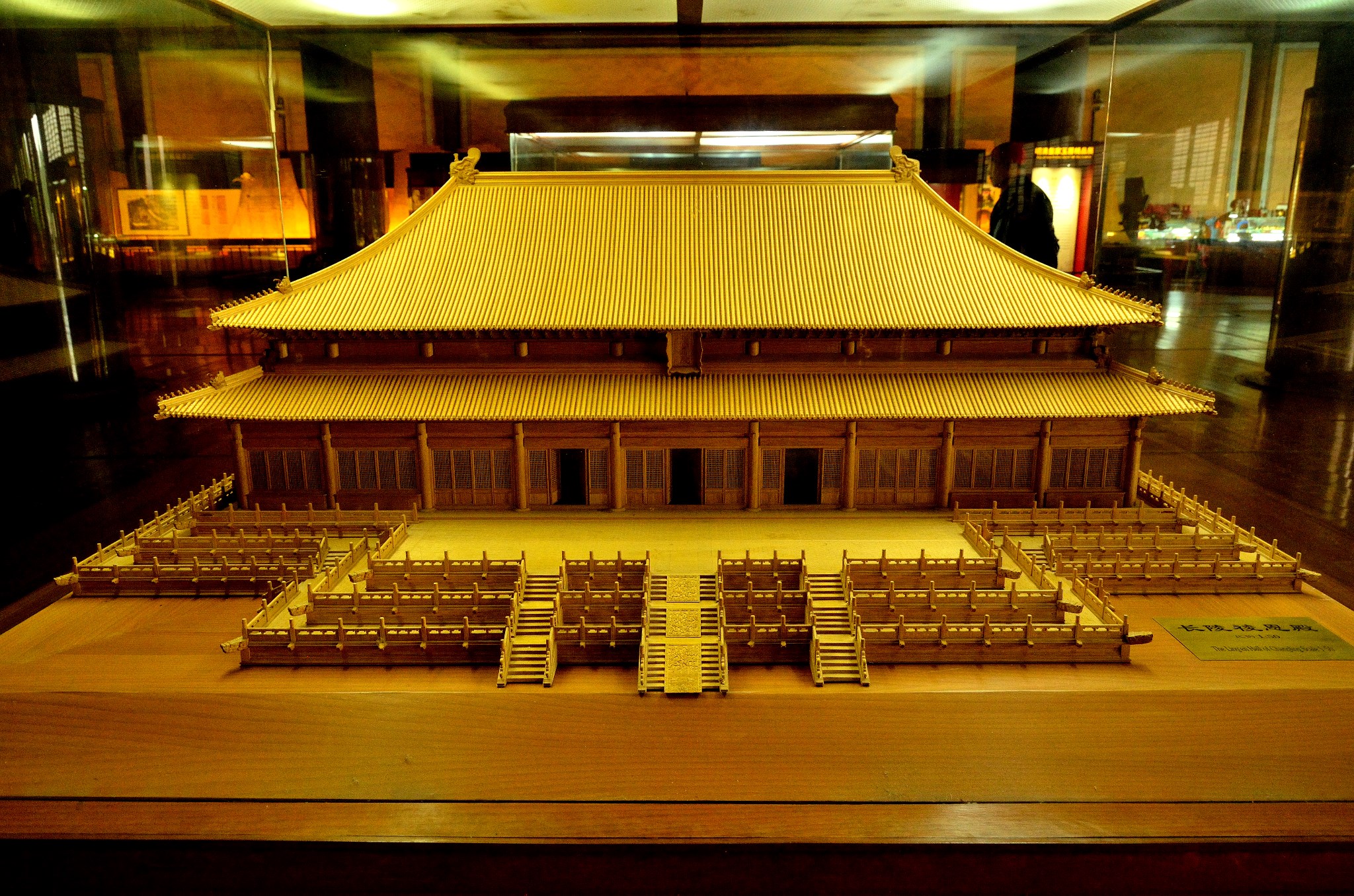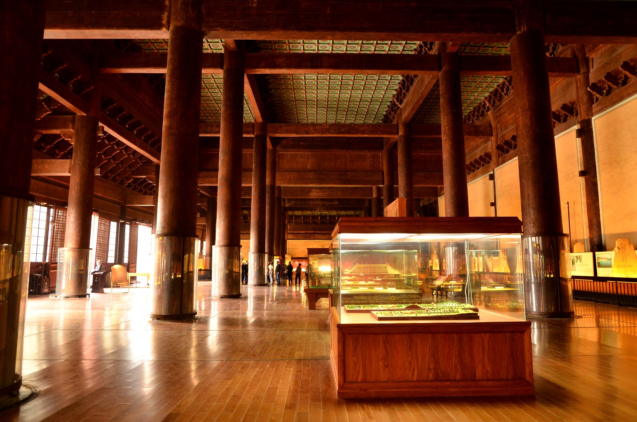 重檐庑殿顶,三层汉白玉台阶,九开间,60根金丝楠木巨柱,全部木构件均用金丝楠木,金砖墁地。