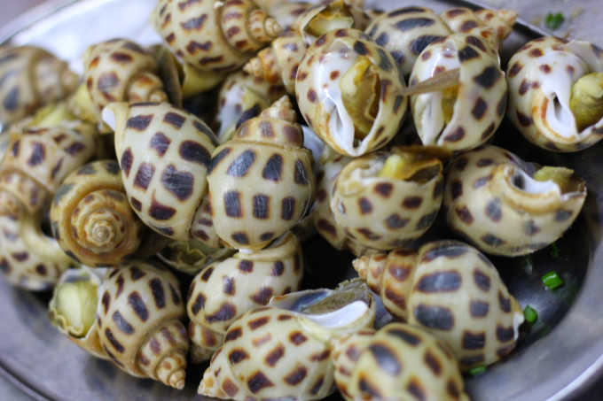 白灼花螺,这个花螺肉很大喔,还非常有嚼劲,蘸着酱吃特别美味,吃的时候需要拿竹签把里面的肉挑出来,不难,哈哈哈,50元1斤。